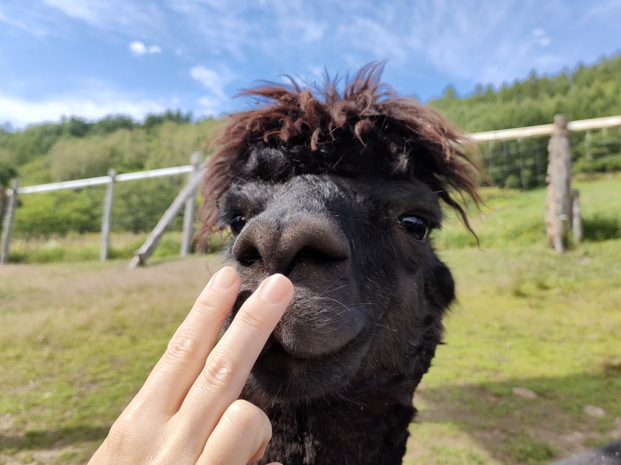 飼育員の方がいろいろ教えてくれて、最初は恐る恐るでも、首根っこ掴んで引き寄せた方が撮影しやすいですよ~とか、鼻とか触ってみてください~(あっ! 温かい…)とか、いろいろ大胆にアルパカとのふれあいの時間を楽しめます。