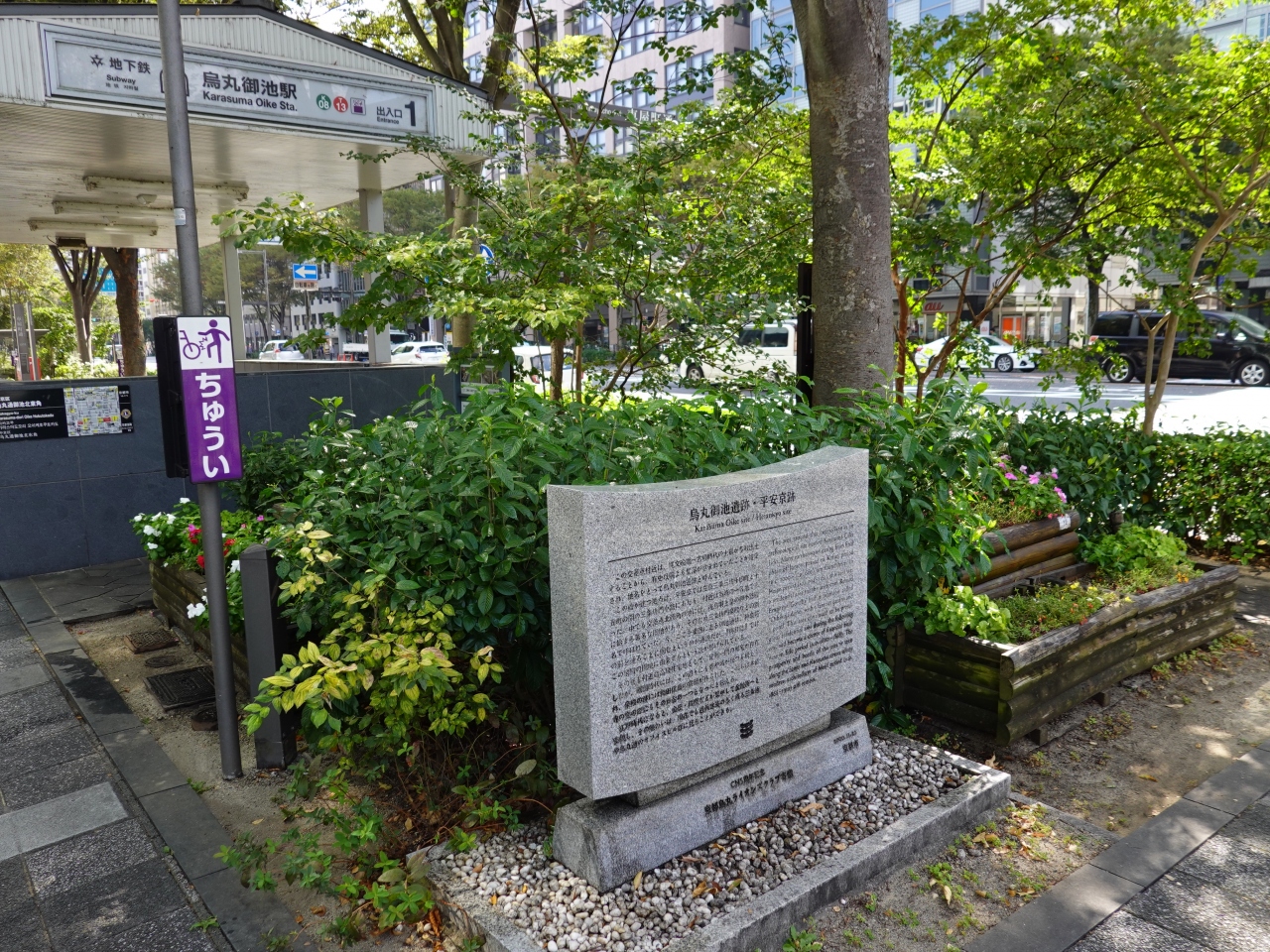 京都市営地下鉄・烏丸御池駅出口すぐの場所に「烏丸御池遺跡・平安京跡」と刻印された石碑があります。2000年に設置された比較的新しいもので、細かな文字で書かれており読みにくいです。文字のみでビジュアルがないのも残念な点です。