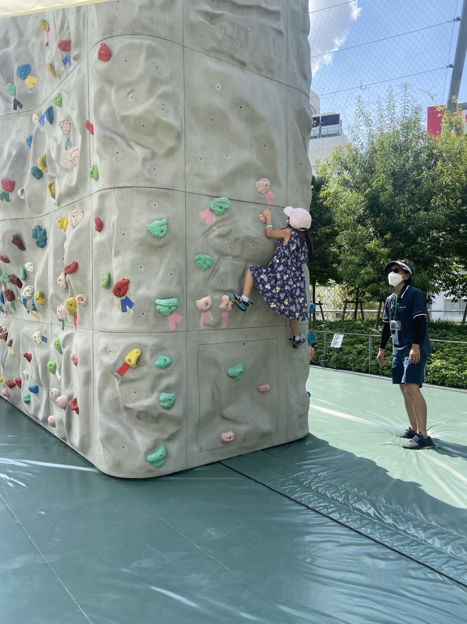 屋上で子供が遊べると聞いて行ってみました。子供ができるボルダリングの遊具があって、1時間単位でお金を払って楽しむスタイル。靴はレンタルできましたが、靴下を履いてないとNGのようで、夏は注意が必要。しかも付き添いの人はボルダリングスペースにはお金を払わないと入れない。