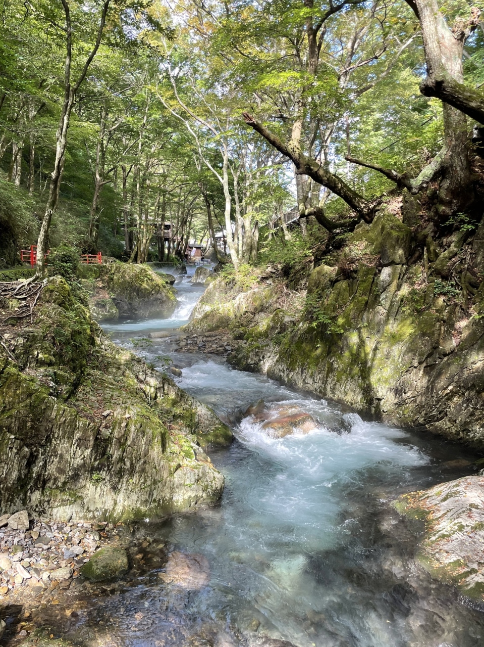 龍泉洞の入口のよこ、美しい清流が流れています。9月のさわやかな朝は朝日に川霧が立ち、ちょっと幻想的な風景でした。川沿いに短いですが、龍泉洞の入口から遊歩道もつづいていました。レンタル釣り具もあり、渓流釣りも楽しめます。