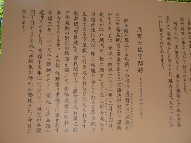 結果的には、氷川神社全体の解説板のみに、浅野土佐守邸跡の解説文が記載されていました。