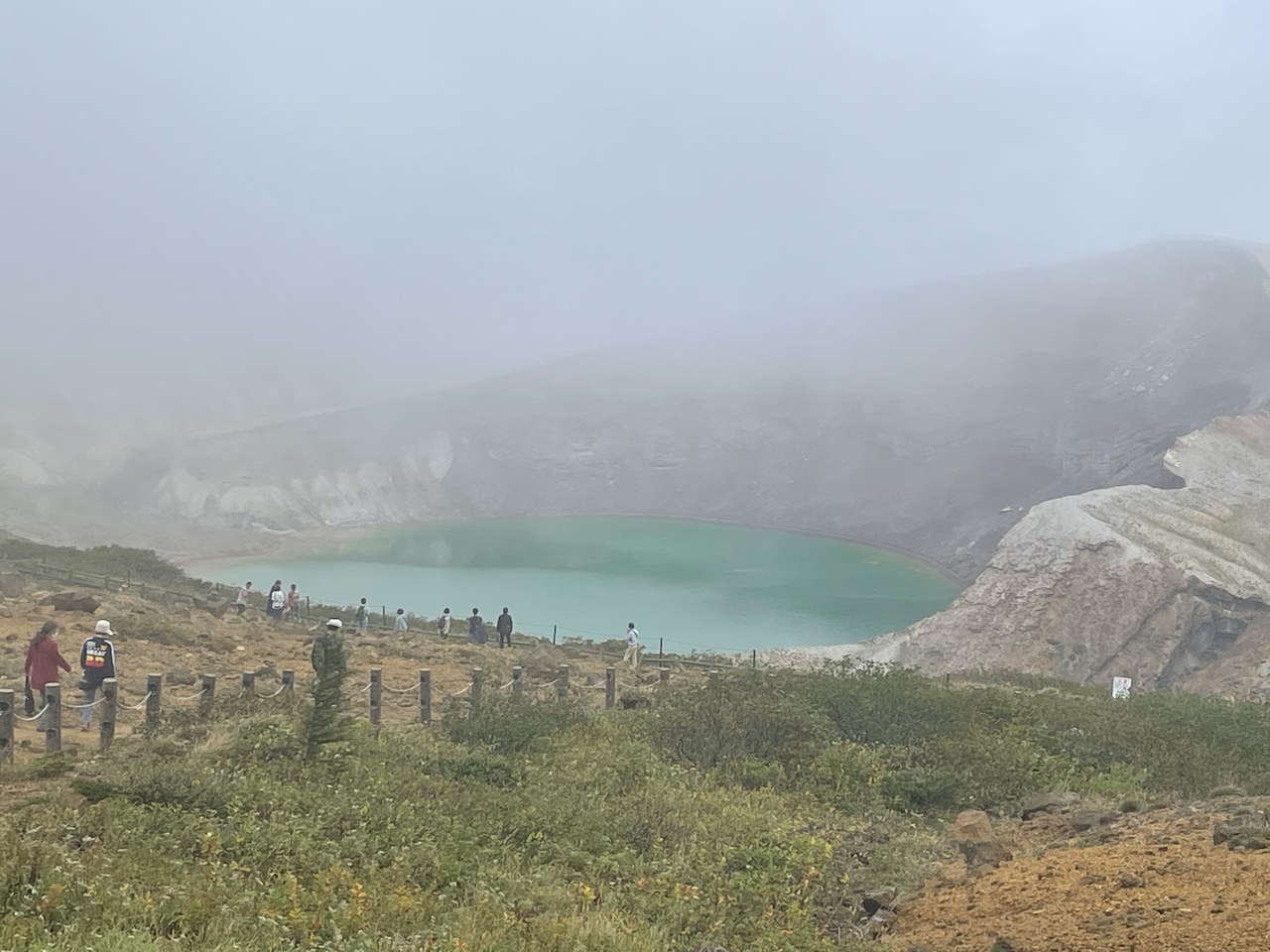 山頂の駐車場からレストハウス横を抜けるとすぐ展望台にたどりつきます。眼下にはお釜が見えるはずですが、ガスと小雨で真っ白でした。お釜が見られる確率は30%ときいておりました。しばらくすると薄日も差してきました。引き返すとエメラルドグリーンの水をたたえたお釜を眺めることができました。