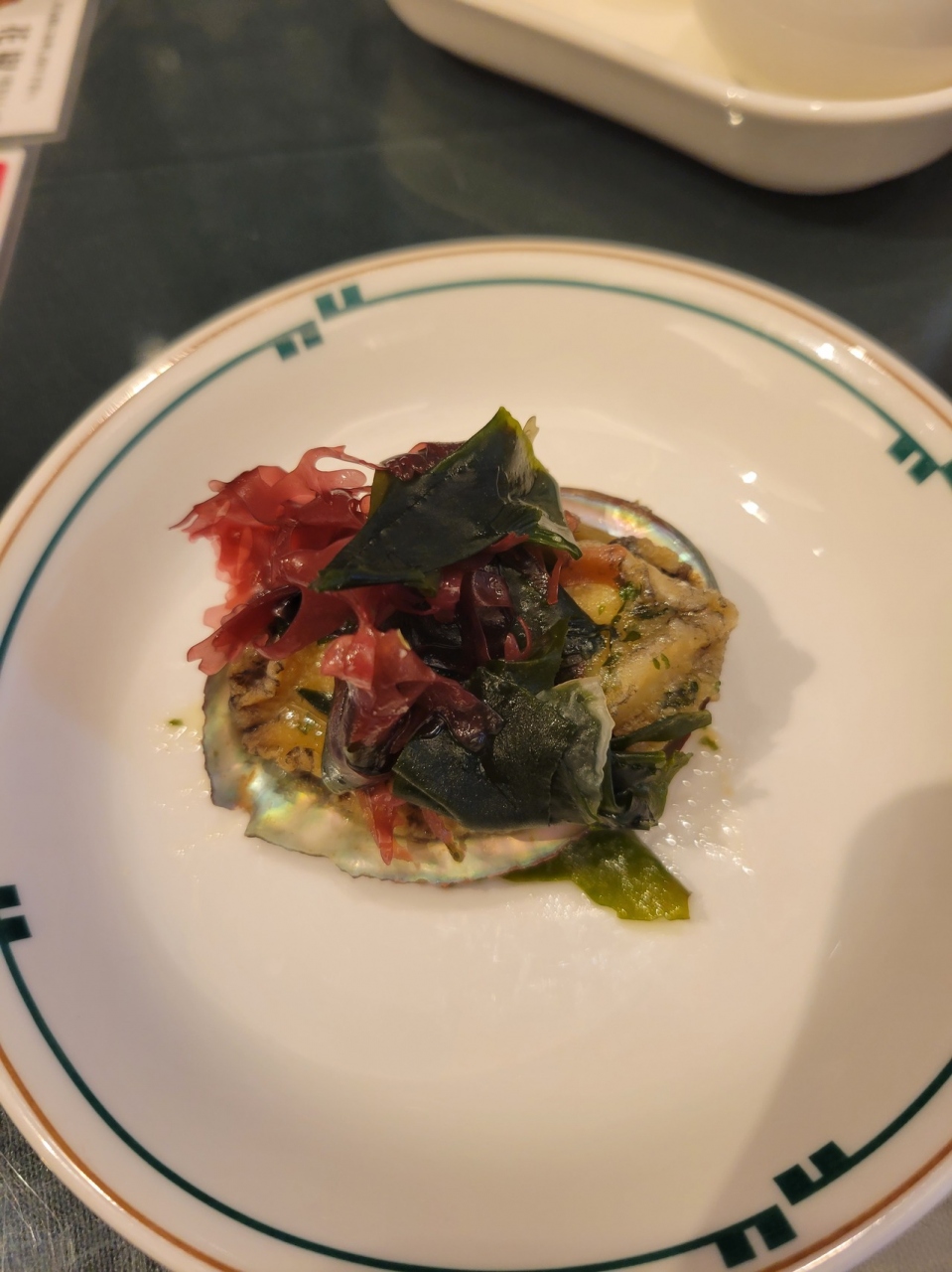 今回は、前菜にクラゲや棒々鶏、焼豚の三種盛り、アワビのガーリックバター蒸し、エビのトマトソース炒め、博多焼きそばを頼んでみました。