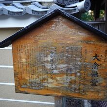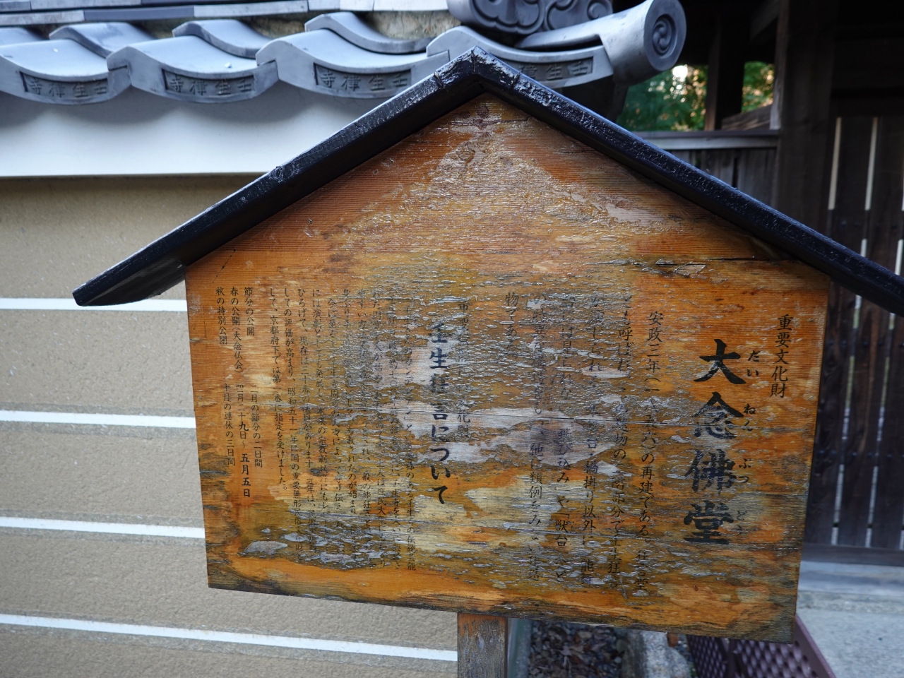 壬生狂言は大念仏狂言のひとつで、毎年節分と4月、10月に壬生寺で行われる無言劇で、重要無形民俗文化財に指定されています。舞台となるのは壬生寺境内にある大念仏佛堂で、狂言堂とも呼ばれるこの建物の2階で行われます。大念仏佛堂前に設置された歴史の重みをひしひしと感じさせる木製の案内書きが印象的でした。