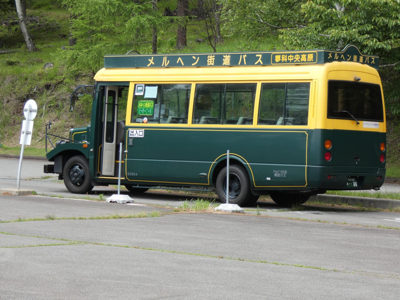 横谷渓谷が見渡せる展望所がある横谷観音の駐車場に停車していた緑と黄色のコントラストが蓼科の自然にピッタリの可愛らしいバス。茅野駅と尖石縄文考古館、横谷峡入口から横谷観音入口へと結んでいます。茅野駅からの観光には便利ですね。