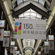 四条通から三条通りまで南北に続く有名なアーケード商店街です。全体的に若い人たち向けのお店が多いかも? レストラン、テイクアウトの食べ物のお店、おみやげ屋、ファッション店などの合間にところどころお寺もあります。今年150年なんですね。大きな垂れ幕やのぼりがたくさんありました。歴史がある商店街ですね。三条通りに出る手前がなぜかちょっとした坂道です。謎です。