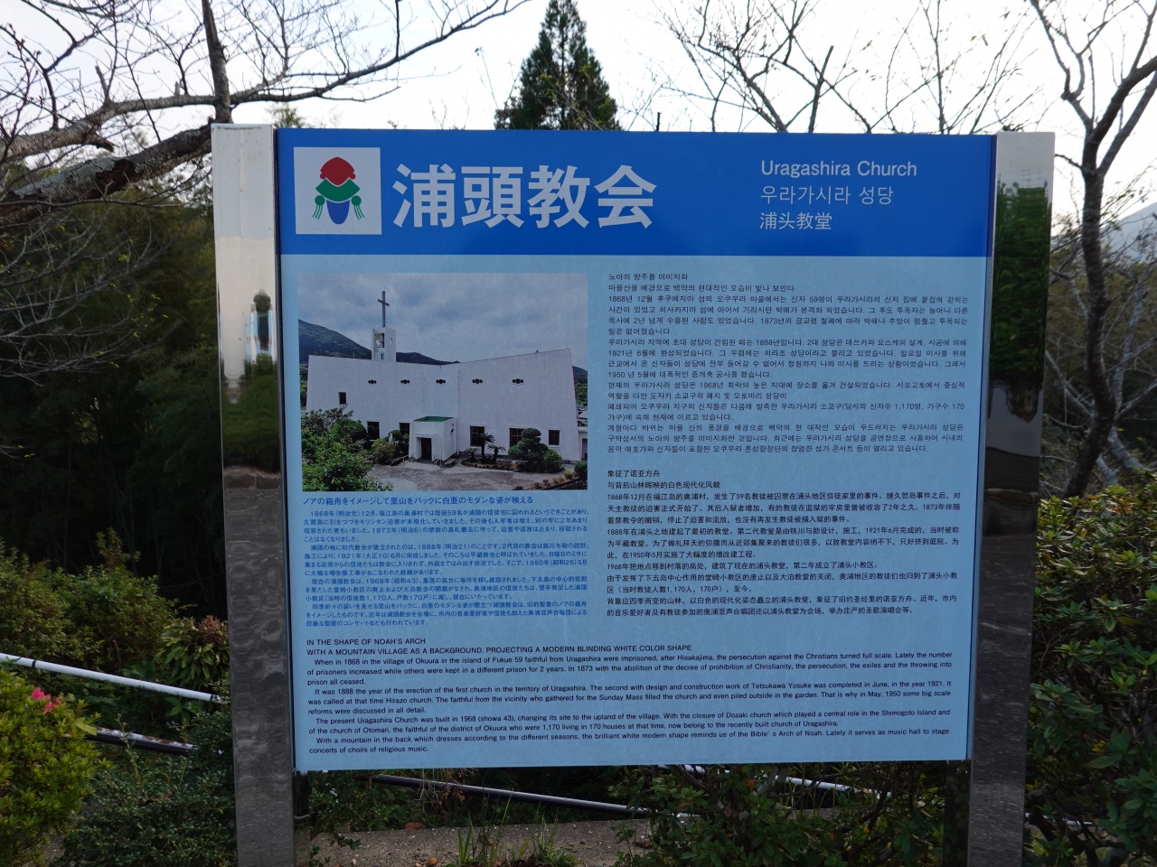 五島列島の福江島の福江港から北へ車で10分ほどのところ、里山の中に、白い教会があります。ここが浦頭教会です。江戸末期、1797年、大浦藩から五島への移住が始まり人々は、表向きは地元の寺の壇徒となりながら、密かにキリスト教を守って静かに暮らしていたそうですが、明治元年、この地区でも激しい迫害が起きたそうです。それから20年後、この地区に初めの教会ができ、今の教会は1968年にこの場所に建てられてもので、ノアの箱舟がイメージされているようです。