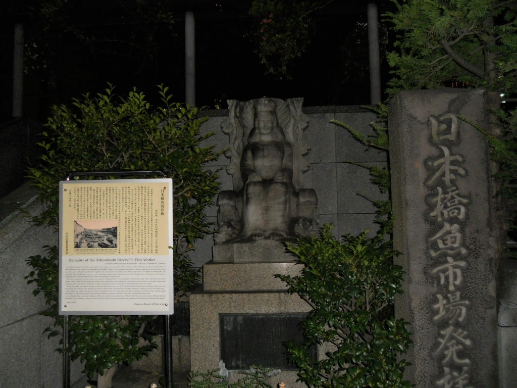 仕事や食事でよく日本橋界隈へ行くので、こちらの「日本橋魚河岸記念碑」も何度か見学していますが、高架下のところで本当にひっそりとした場所にあるので、夜はさらに目立たない。。