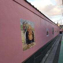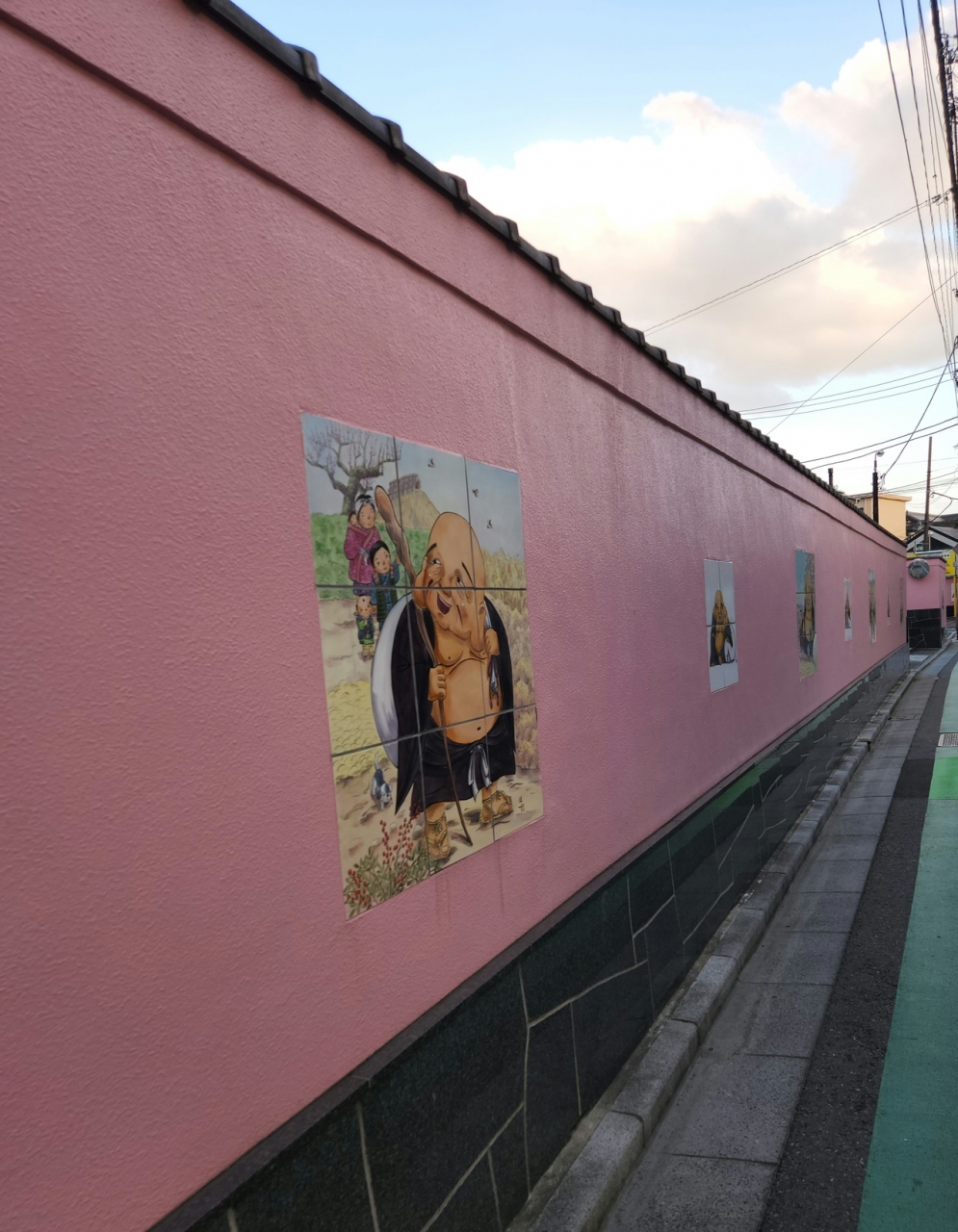 お寺を認識する前に、何とも目立つピンクの壁^^;、その壁には可愛らしい布袋様の絵が何枚もあり見ているだけで和みました。