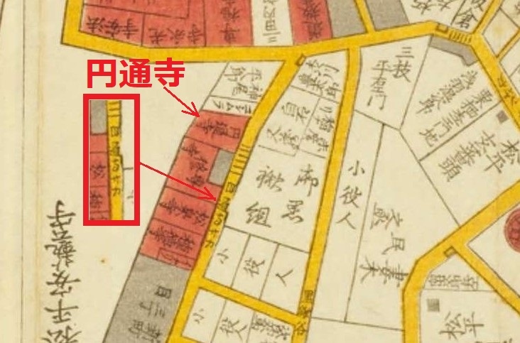 江戸時代の江戸切絵図を見ますと、円通寺坂の名称が記載されています。