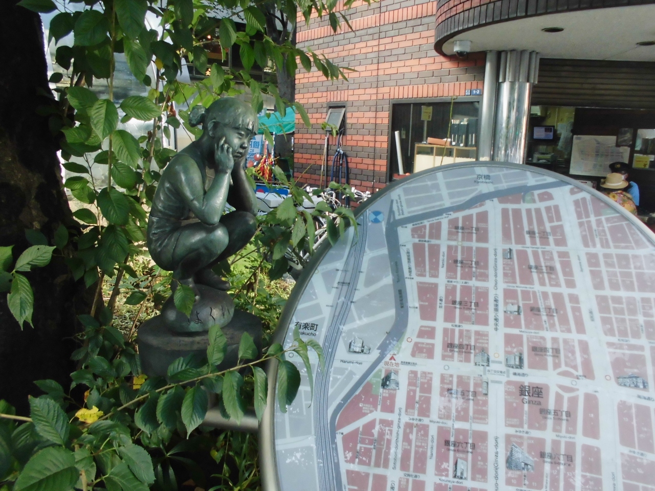 銀座にあります。中膝で頬杖をついた少年の像です。タイトルの通りなんとなくさみしそうな表情をしています。この像なんですが、意外と見つけにくい場所にありました。たぶん植物が邪魔なので切ったらいいと思いました。