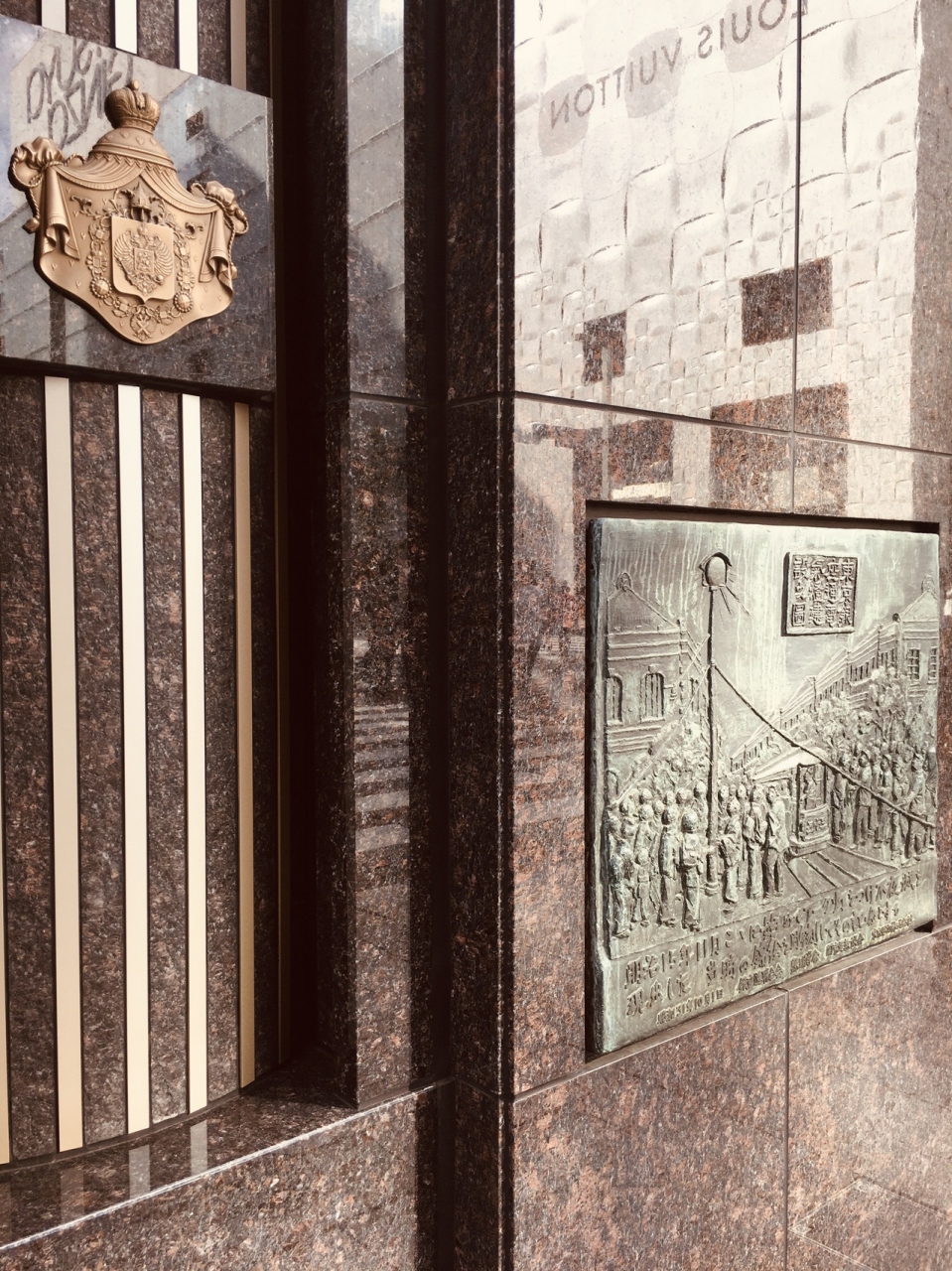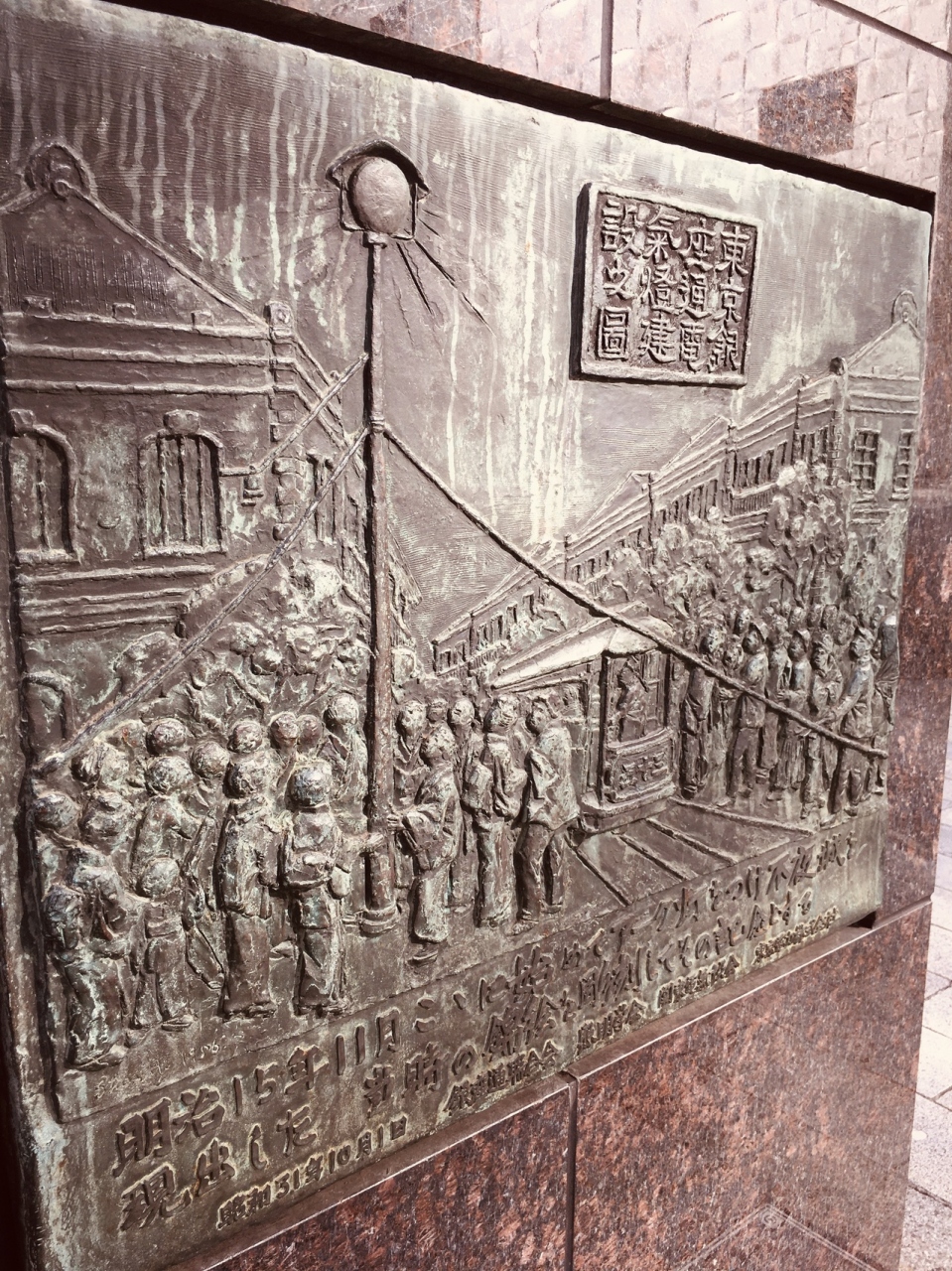 明治15年11月にアークの灯をつけて不夜城を現出し、当時の風化を彫刻で残していました。着物等を着た人々が塔を見上げ、横には路面電車も走っていました。交差点の角のビルにあり、何人か立ち止まって見学している人もいました。