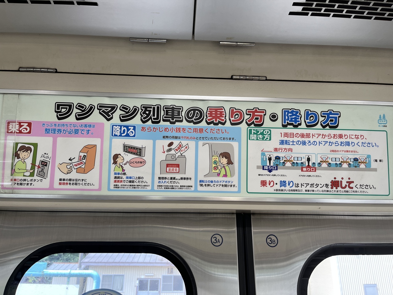 電車内には ワンマン列車の乗り方•降り方のご案内があります。