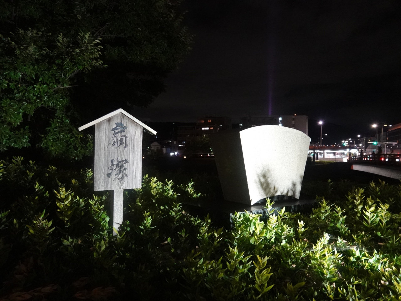 五条大橋の西北詰に「扇塚」があります。この場所は、扇発祥の地ということで御影石の石碑とともに、「扇塚」と書かれた木製の札が設置されています。通りかかったのが夜で、植込みの中、灯かりもなく真っ暗でした。照明で照らすなど、一工夫あればもう少し引き立つのではないかと思いました。