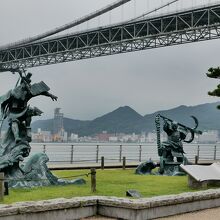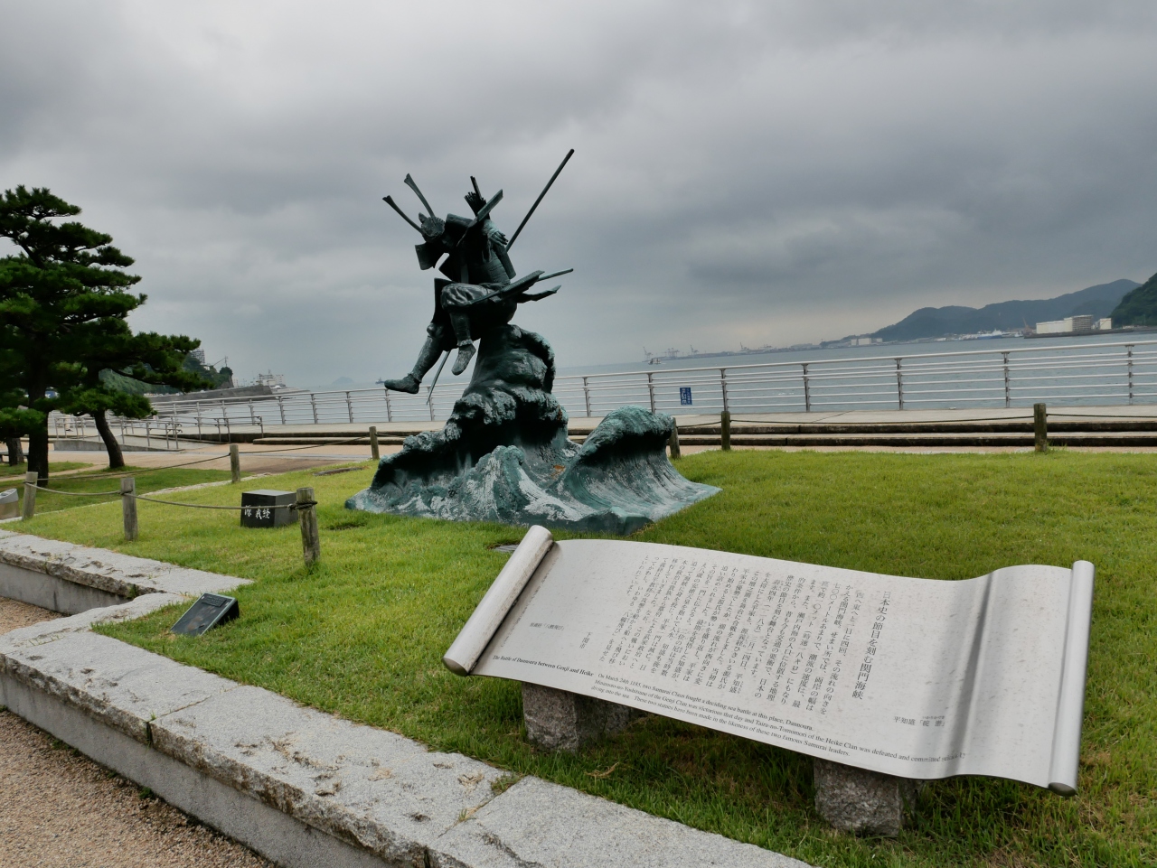 公園の中には、源義経と平知盛の戦うシーンの銅像(なぜ、知盛が碇を持って戦っているのか不明ですが)、幕末の大砲のレプリカなど、見どころもあります。