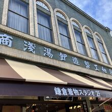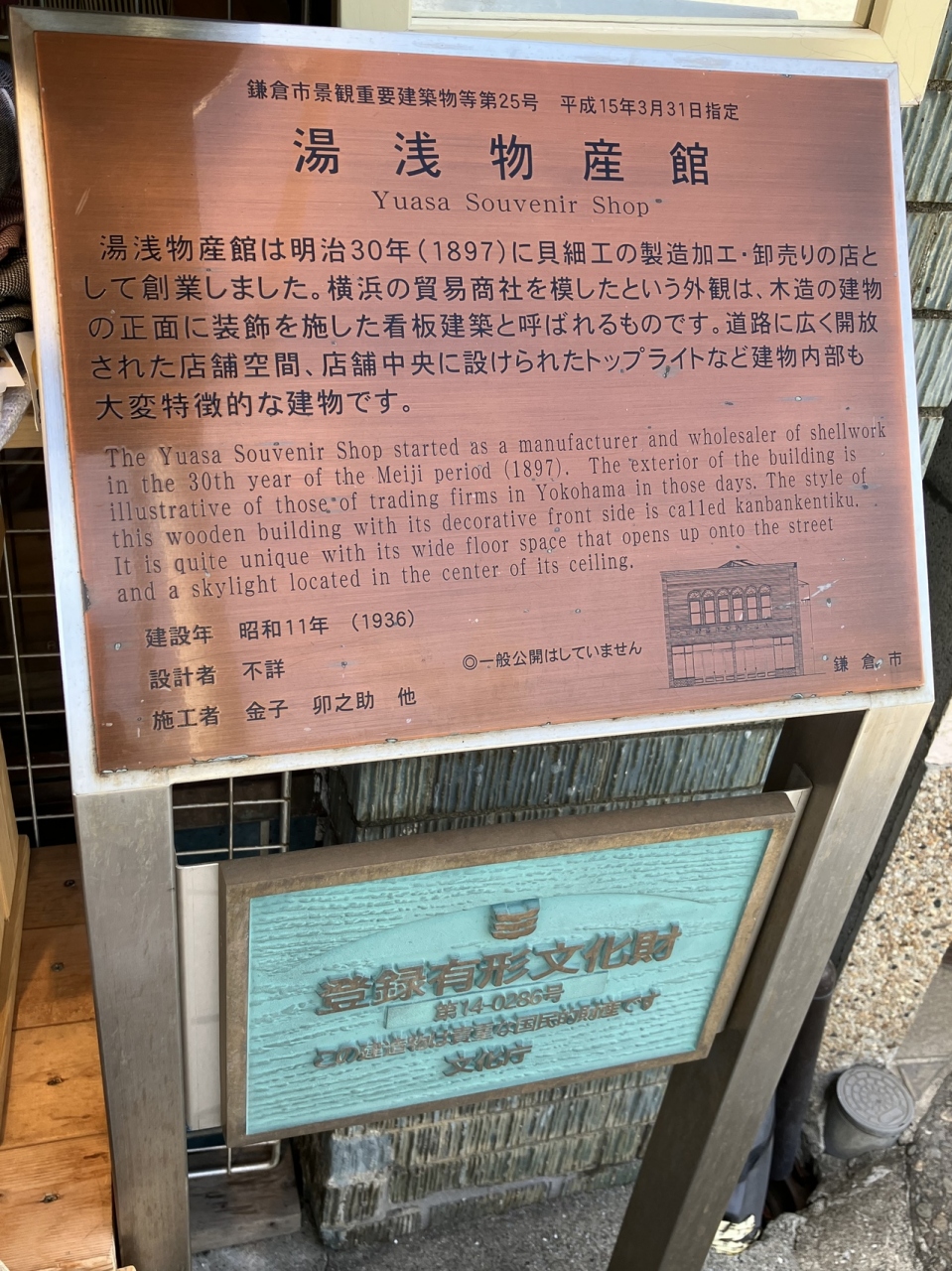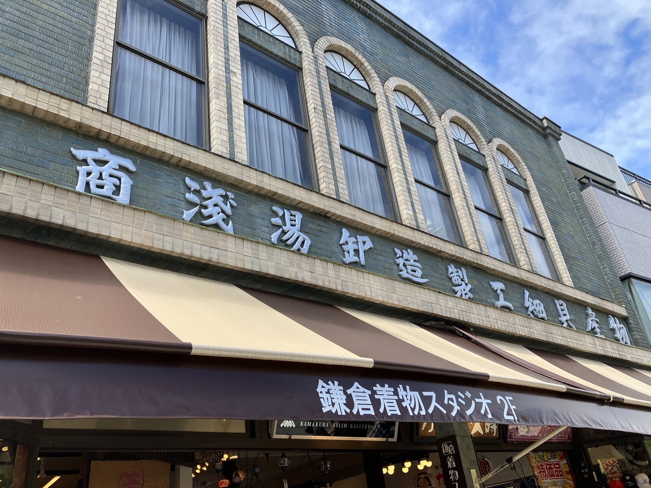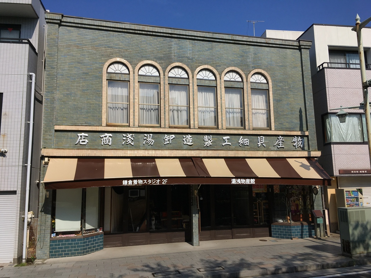 鎌倉駅東口から徒歩で10分ほどです。若宮大路の西側に面しています。明治30年創業の貝細工の製造加工、卸し売り店でした。外観はコンクリート造りに見えますが、木造で「看板建築」という当時流行った建築様式の建造物です。正面だけ洋風建築に似せて装飾を施します。今は奥にカフェ、正面に帽子屋と絨毯、ランプ屋。2階は写真スタジオとなっています。内装もトップライトを配したオシャレでレトロな雰囲気を感じます。有形文化財に指定されて鎌倉では貴重な商店です。