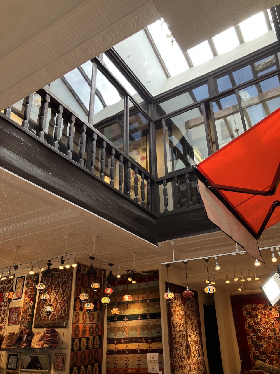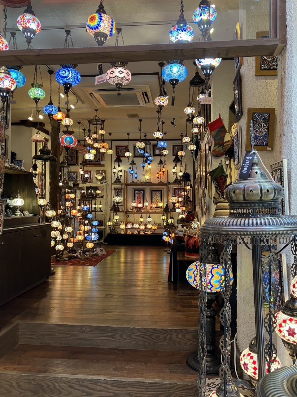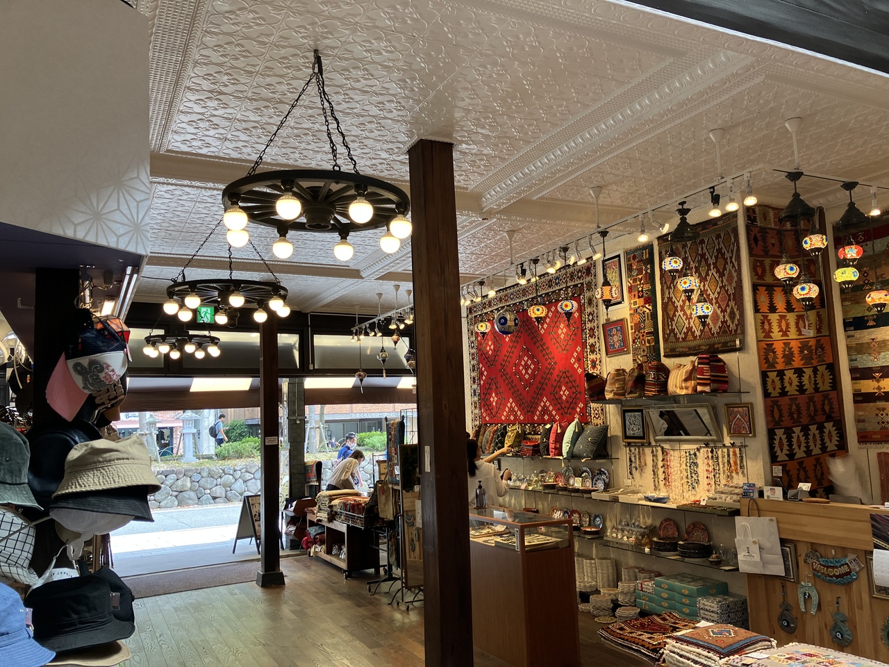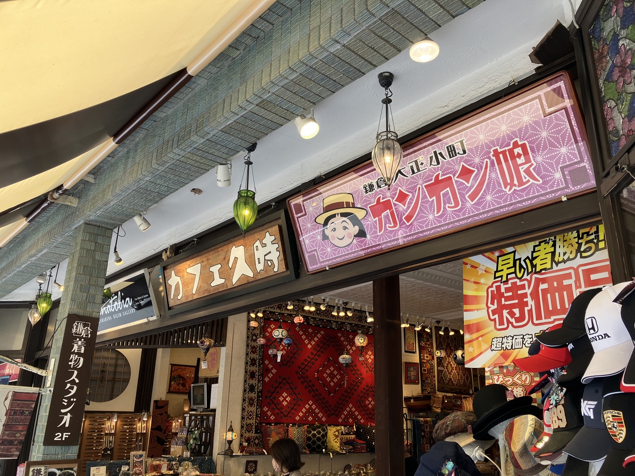 鎌倉駅東口から徒歩で10分ほどです。若宮大路の西側に面しています。明治30年創業の貝細工の製造加工、卸し売り店でした。外観はコンクリート造りに見えますが、木造で「看板建築」という当時流行った建築様式の建造物です。正面だけ洋風建築に似せて装飾を施します。今は奥にカフェ、正面に帽子屋と絨毯、ランプ屋。2階は写真スタジオとなっています。内装もトップライトを配したオシャレでレトロな雰囲気を感じます。有形文化財に指定されて鎌倉では貴重な商店です。