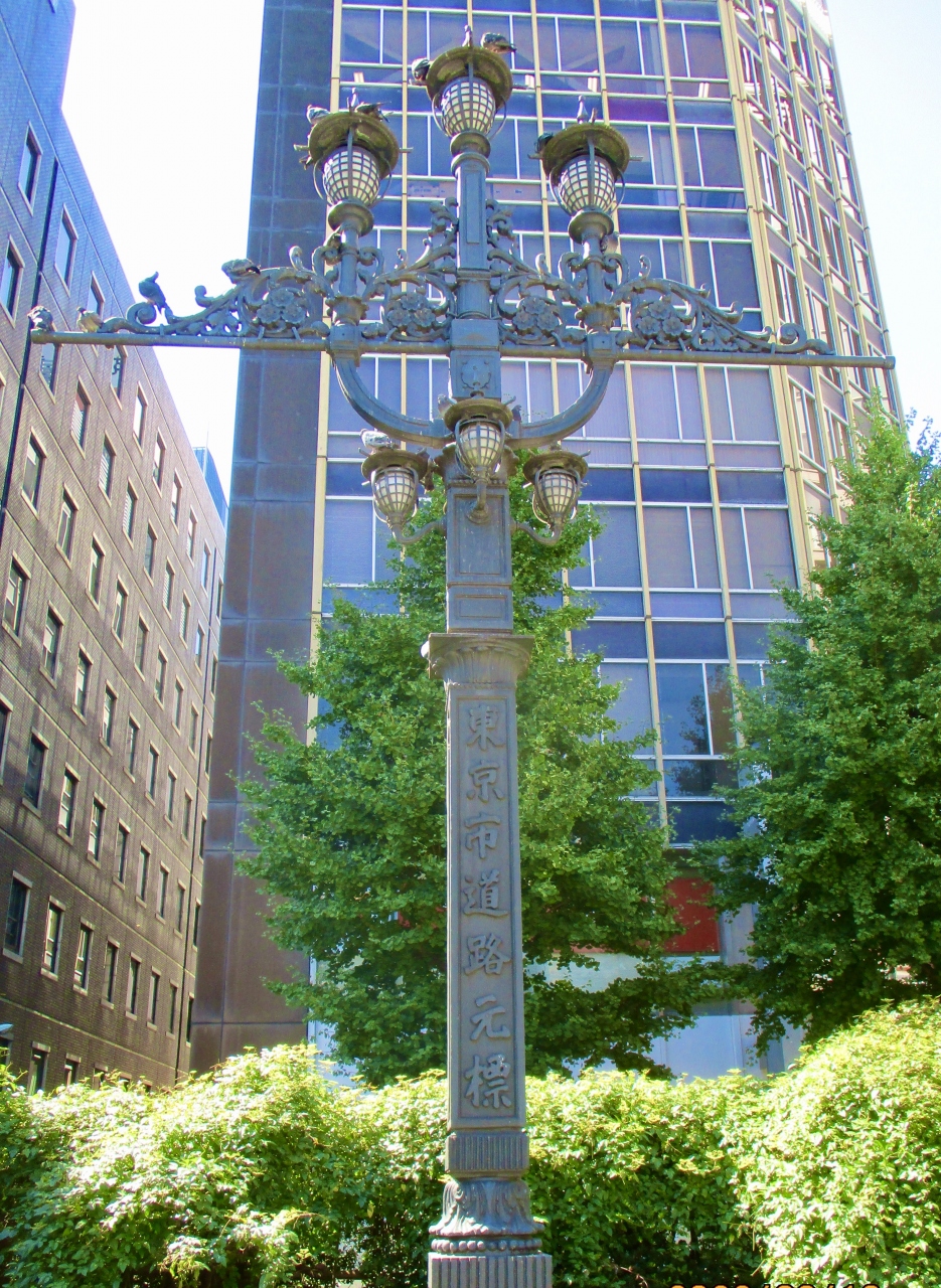 日本橋高島屋から日本橋三越本館・新館に行く途中に、いつも日本橋を渡りますが、橋の上の麒麟を眺めて、橋を渡りきったところに、元標の広場があって、その中に、国の道路元標の複製と共に、たっていました。十字の素敵な柱です。