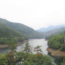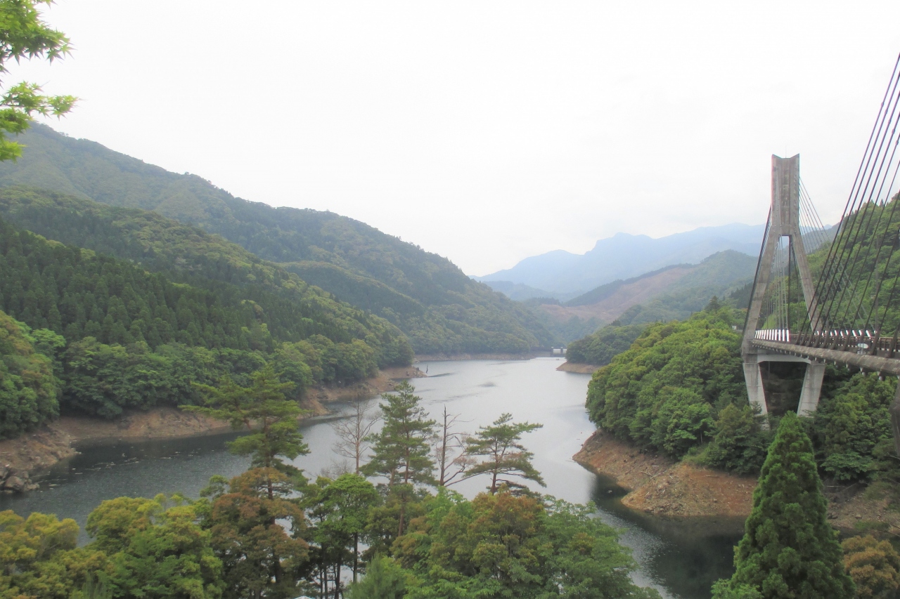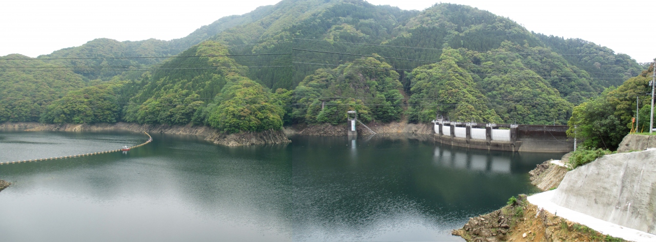 北川ダム湖は、大分県から宮崎県へと流れている北川(水系としては五ヶ瀬川水系に属しています)の、大分県側に築かれた北川ダムで生まれたダム湖です。この北川の特長は標高差の少ないことです。従って、ダム湖は異常に長く、ダムから上流6~7kmまで続いています。5月に訪れましたが、梅雨の前だったので、水面から上に岩肌がかなり見えました。ダム堤のところを海抜で見ると、可動堰の下は154.5mとのことです。可動堰の高さは6.5mほどですから、現在の水位は148.5mくらいでしょう。通常時の満水位160.5mですが、利水最低水位は131.0mだそうで、意外なほど高いですねぇ。そうするとダム湖の貯水率ですが、単純比率では計算出来ませんが、ダム湖の長大さを考えると30%台だと思います。取り敢えずは発電可能水位は保っているのだと思いました。