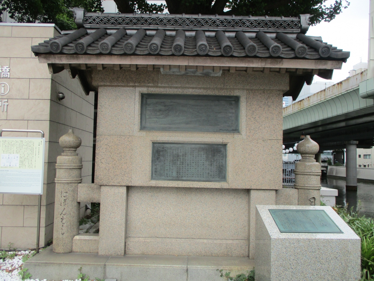 地下鉄東京メトロ日本橋駅から北へ数分歩くと、日本橋川にかかる日本橋の南詰の西側にありました。観光案内所のすぐ横です。江戸時代には、ここには、高札場が設置されていたそうです。碑には日本橋の由来が記されています。