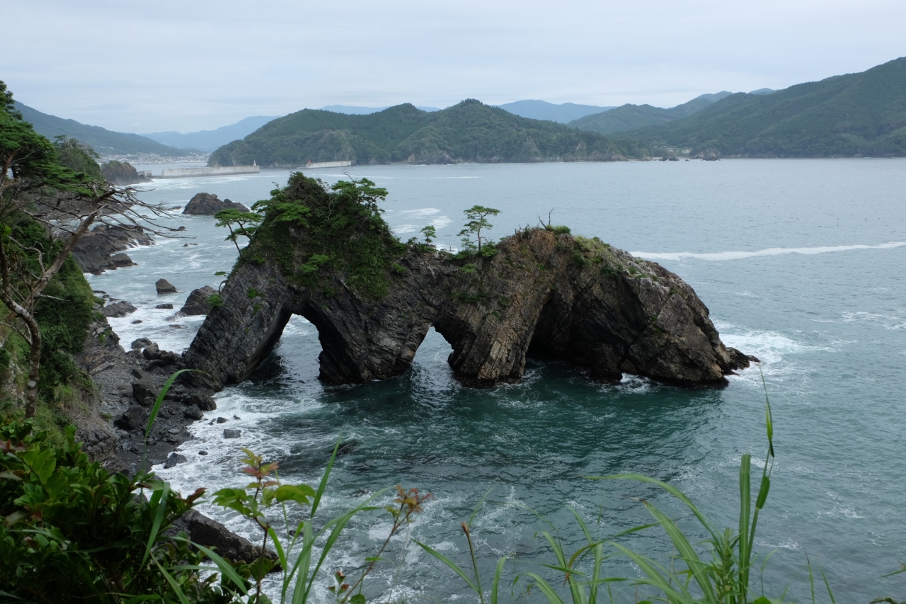 大船渡南部の末崎半島の碁石海岸にある奇岩です。一億三千年前の地層が荒い波の浸食を受け、柔らかいところが削られ穴が開いた不思議な形をした岩です。