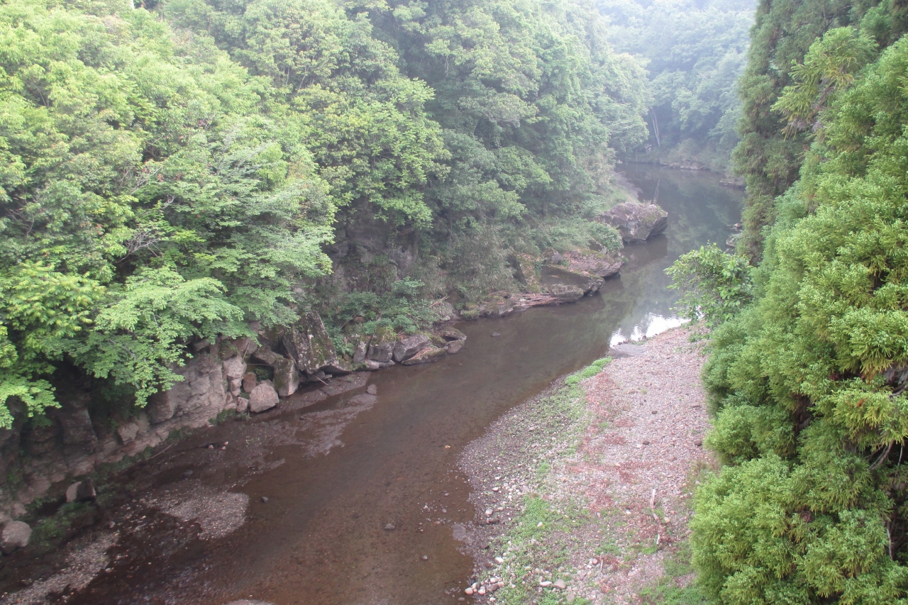 虹澗橋は国道502号線が三重川を渡る新虹澗橋の下流200mくらいのところにありました。右岸側が臼杵市野津町、左岸側が豊後大野市三重町となる三重川に架かっている石橋です。現在は車の通行は出来ない様になっていましたが、橋の中心には中央線が残っていて、近年まで現役だったことが偲ばれました。1821年(文政4年)に起工し、1824年(文政7年)に竣工した単アーチ橋で、橋長は31m、幅員は6.1m、ほぼ半円形のアーチ径間は25.1mあり、架橋時、石橋の径間長として日本一だったとのことです。