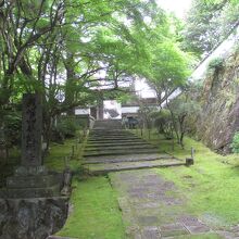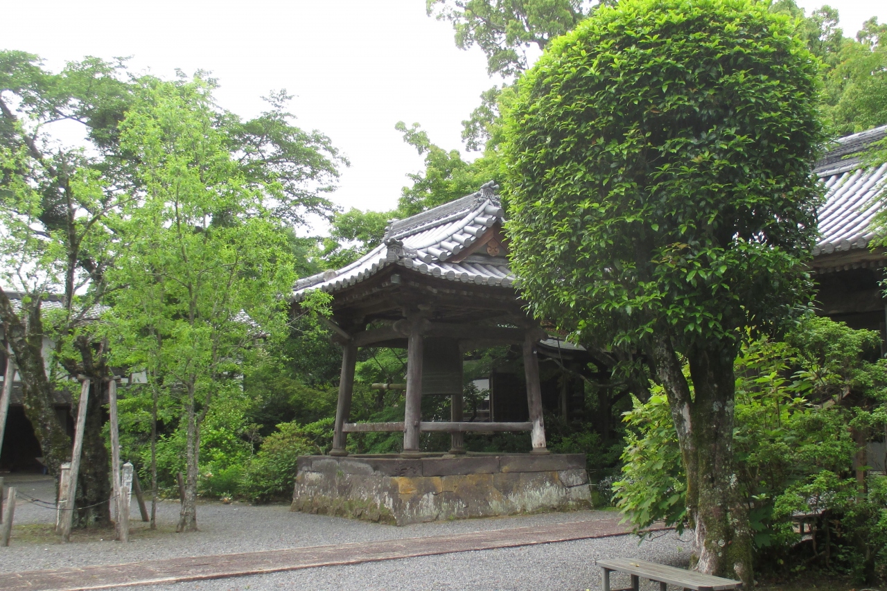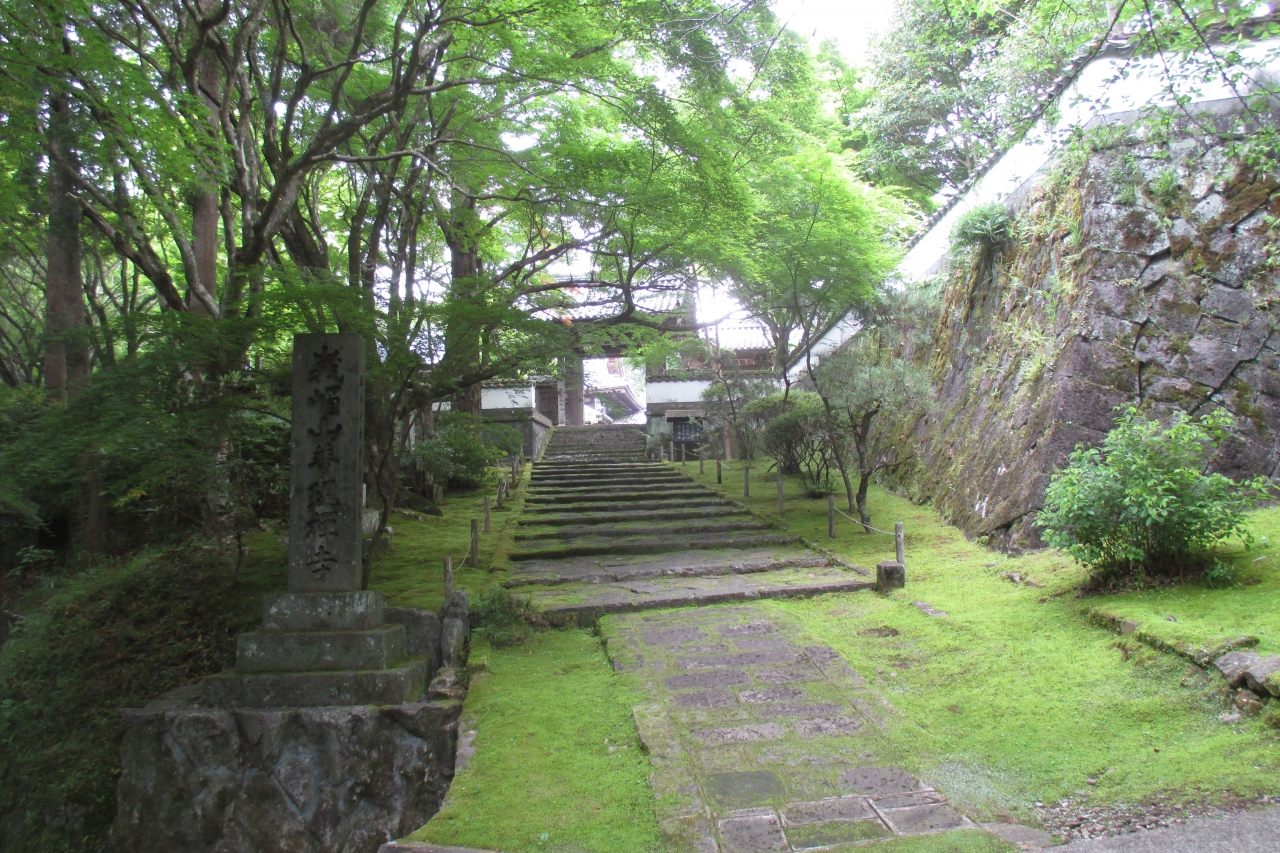 普現寺は、国道10号線(国道502号線)に入口の案内が立っていて、そこから横の丘に上がったところにありました。ここは紅葉の名所とのことで、参道はもみじの木で埋まっていました。但し、訪れた5月は緑に溢れていましたが・・・。山門前の階段は苔が生えていて厳かな雰囲気が拡がっていました。豊後国主大友氏第2代当主の大友親秀の五男、親直(野津五郎頼宗)が、白象に乗った普賢菩薩の夢を見たことから、1294年(永仁2年)に、野津院筒井村(野津地区の北部?)に妙楽寺を建立したと伝わっているそうです。天正年間(1573年~1593年)の薩摩・島津氏の豊後侵攻によって荒廃しますが、1647年(正保4年)に、現在地(当時は板屋村)に寺号を普現寺と改めて再興されたとのことです。こちらのお寺さんには、豊後の奇人・吉四六さんのモデルである、初代廣田吉右衛門さんの菩提寺として位牌が安置されていて、境内のもみじの林の中にはお墓もありました。なお、山号は峩嵋山(がびさん)で、臨済宗妙心寺派のお寺さんです。