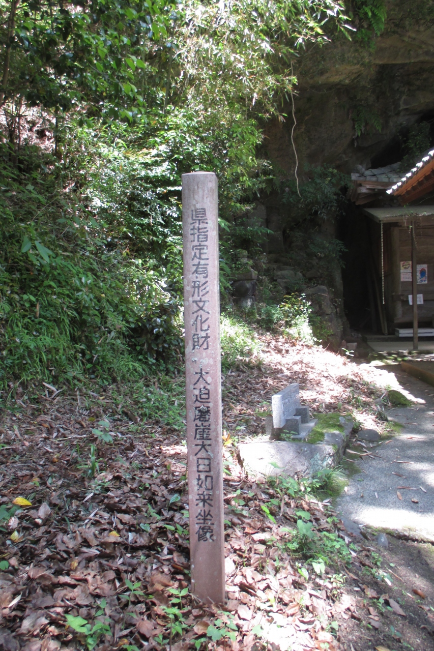 約3.2mの高さのある大迫磨崖仏は正式には大迫磨崖大日如来坐像というもので、室町時代の1533年(天保2年)頃の作と伝えられているそうです。ここの岩質が柔らかいので、岩肌に大まかな像を彫り、顔や腕などは麻等の繊維を混ぜた粘土で厚さ15~20cmに造形し、衣は漆喰で整形した石芯塑像なのだそうです。江戸時代に修復があった様ですが、場所として保存条件が悪いのでかなり形が崩れてしまっているのだそうです。境内の一画に稲荷厳島社が祀られていました。ここは内陸ですが、どんな経緯で海の神様が祀られたのでしょうか。お社が再建されていました。今も、信仰を集めているのでしょうね。