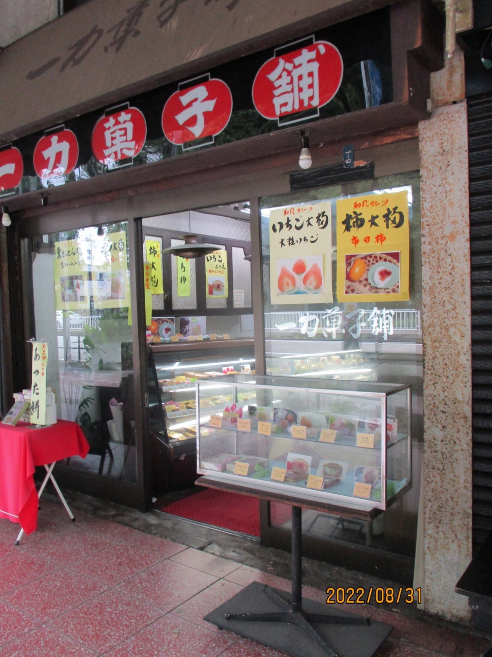 平日の午前中に、熱田神宮から熱田駅へ向かう商店街の中にありました。大粒ないちごが入った「いちご大福」や市田柿が入った「柿大福」などを販売していましたが、案内は全て手書きで、見るからに老舗のお菓子屋さんでした。