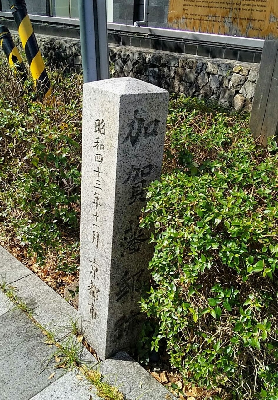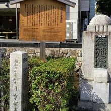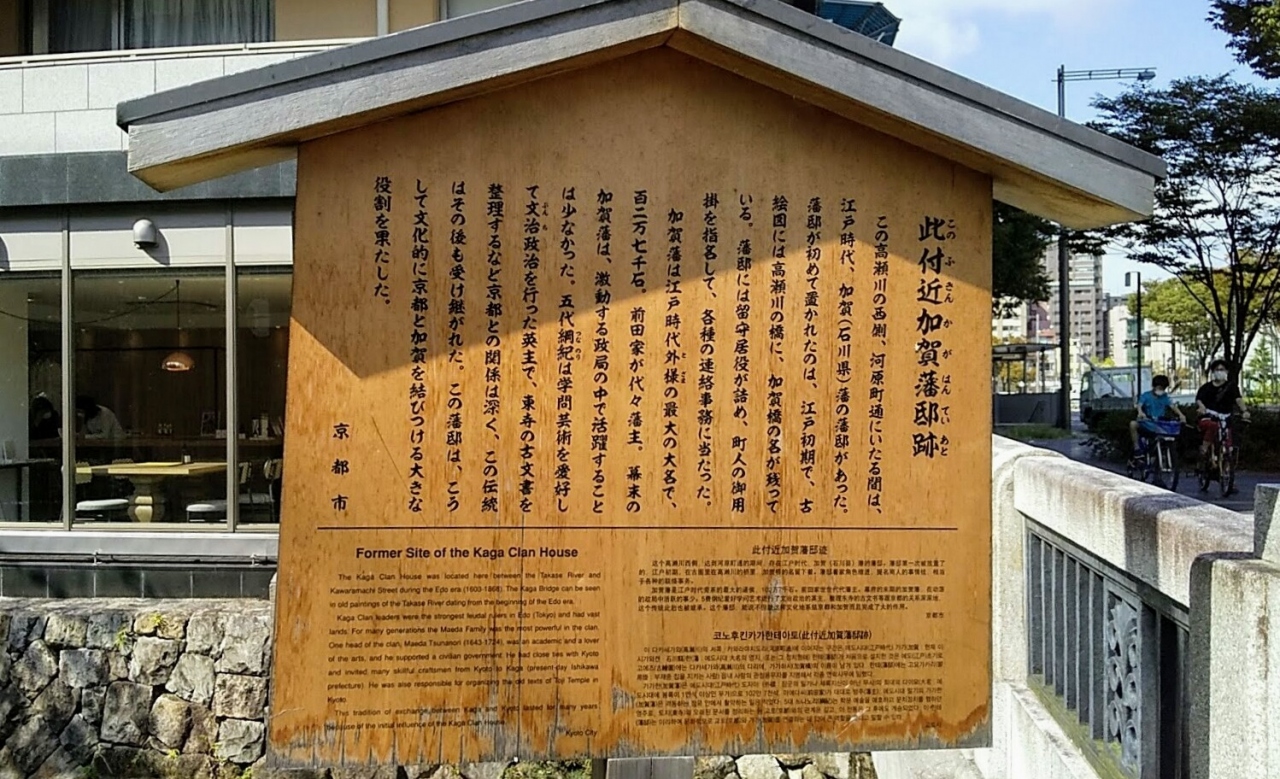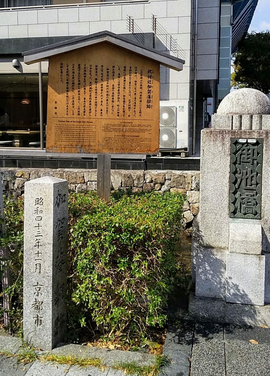 木屋町通の御池橋たもとに「加賀藩邸跡」の石碑と駒札がありました。