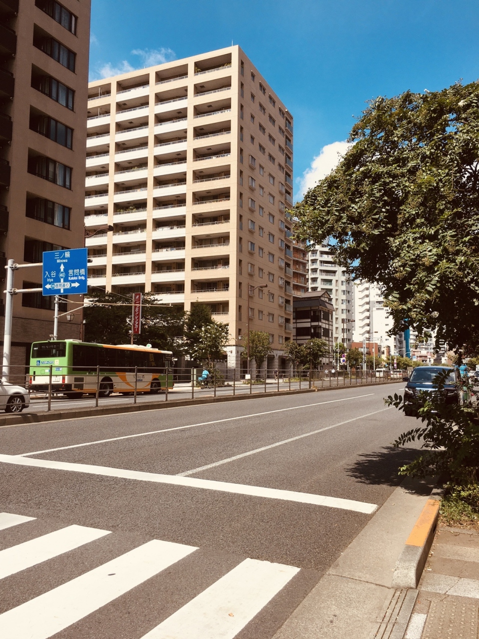 大きな通りで交通量も多く、バス停と地下鉄駅もありました。片側3車線の車道で、歩道は広めで、沿道にはビルが立ち並び、いくつかの枝道に分かれていました。歩道と車道の間には木がいくつか立っていました。良く見かけるような光景の道でした。