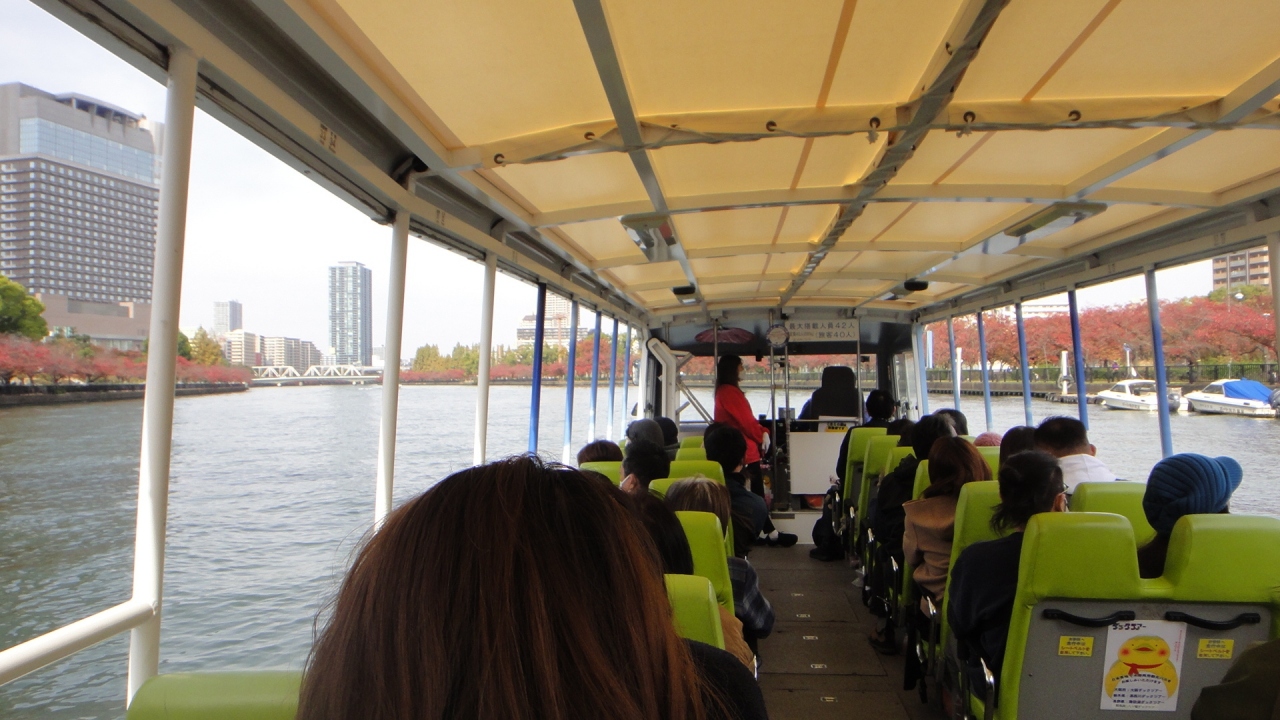 天満橋から大阪城西側をバスとして走り、途中、造幣局沿いの大川をボートとして川を進む。再び陸に戻り、源八橋、天神橋筋を経てはちけんやで終点。