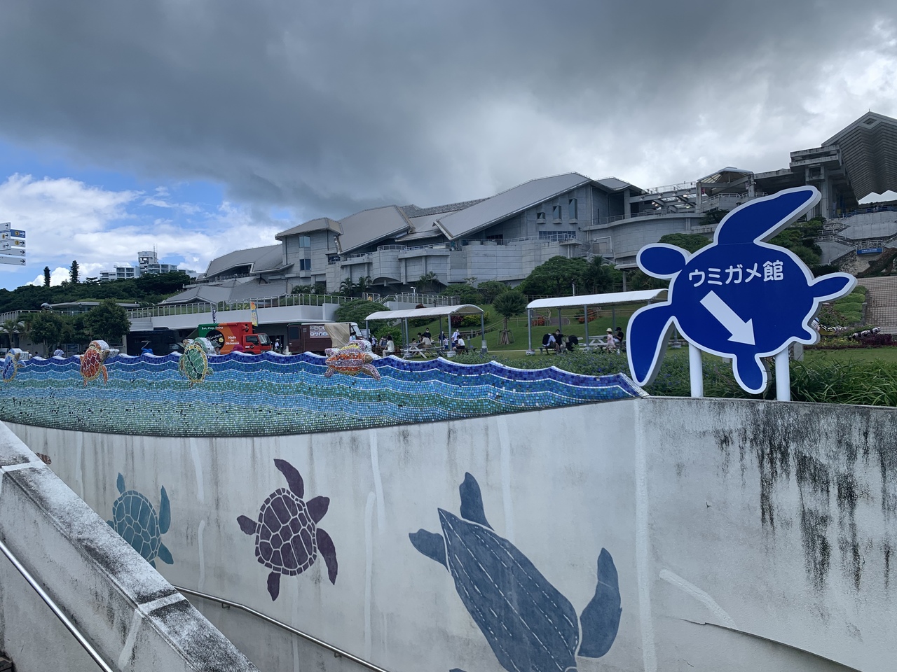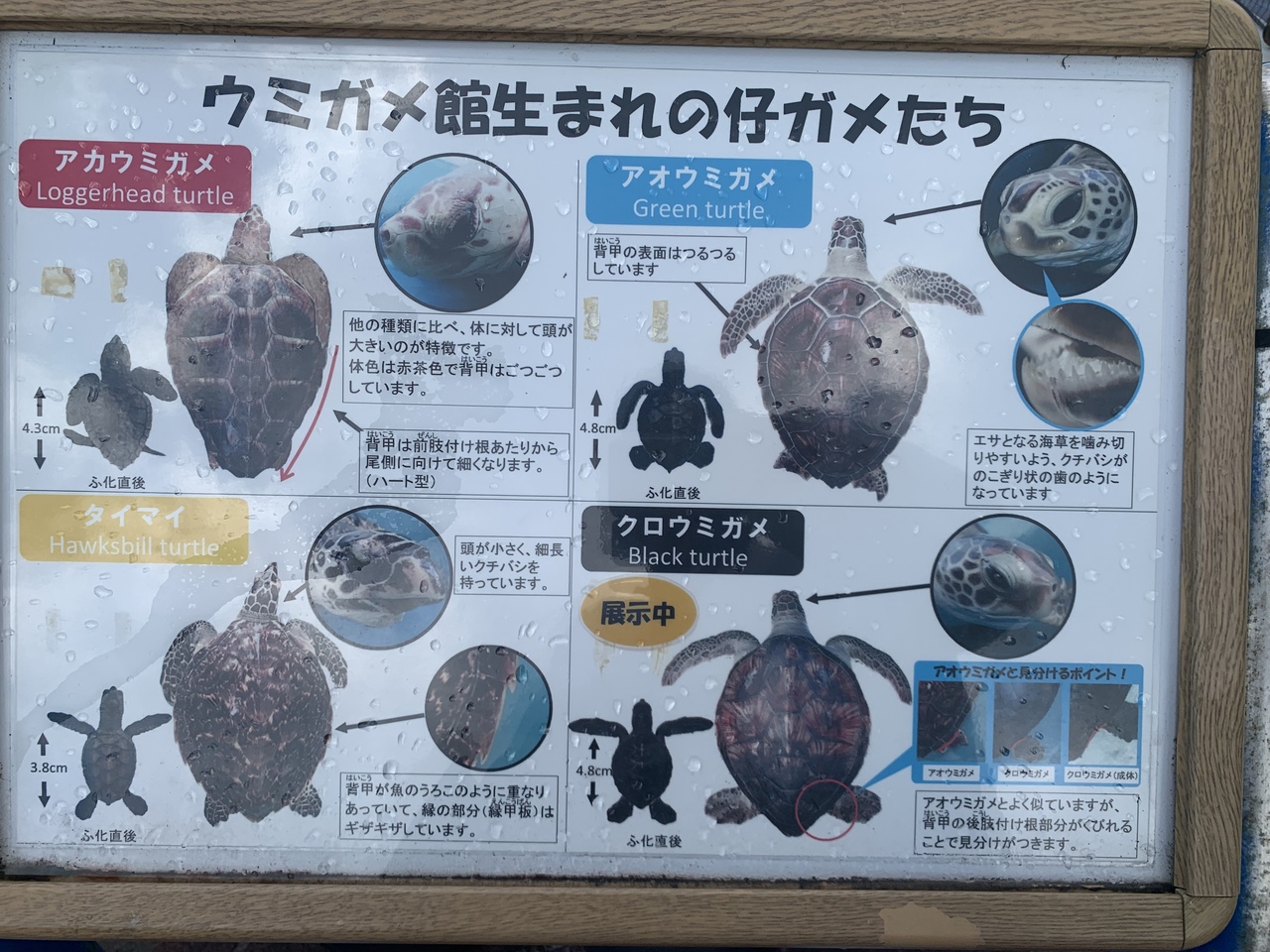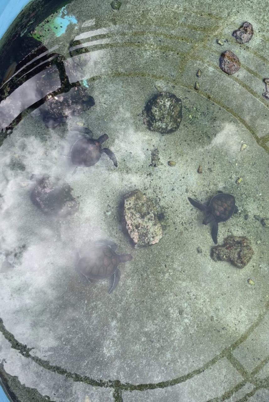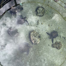 海洋博公園のオキちゃん劇場のとなりにあります。クロウミガメ、アオウミガメ、アカウミガメ、タイマイの4種類が泳いでいる大きなプールと、赤ちゃんウミガメがいる小さなプールがあります。