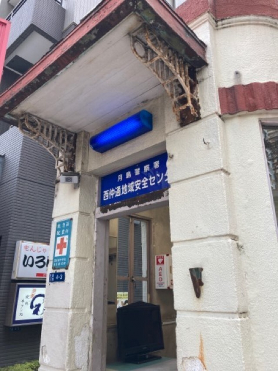 月島のもんじゃストリートである西仲通り商店街の真ん中にある交番です。
