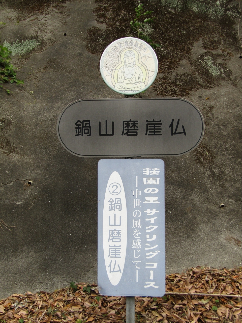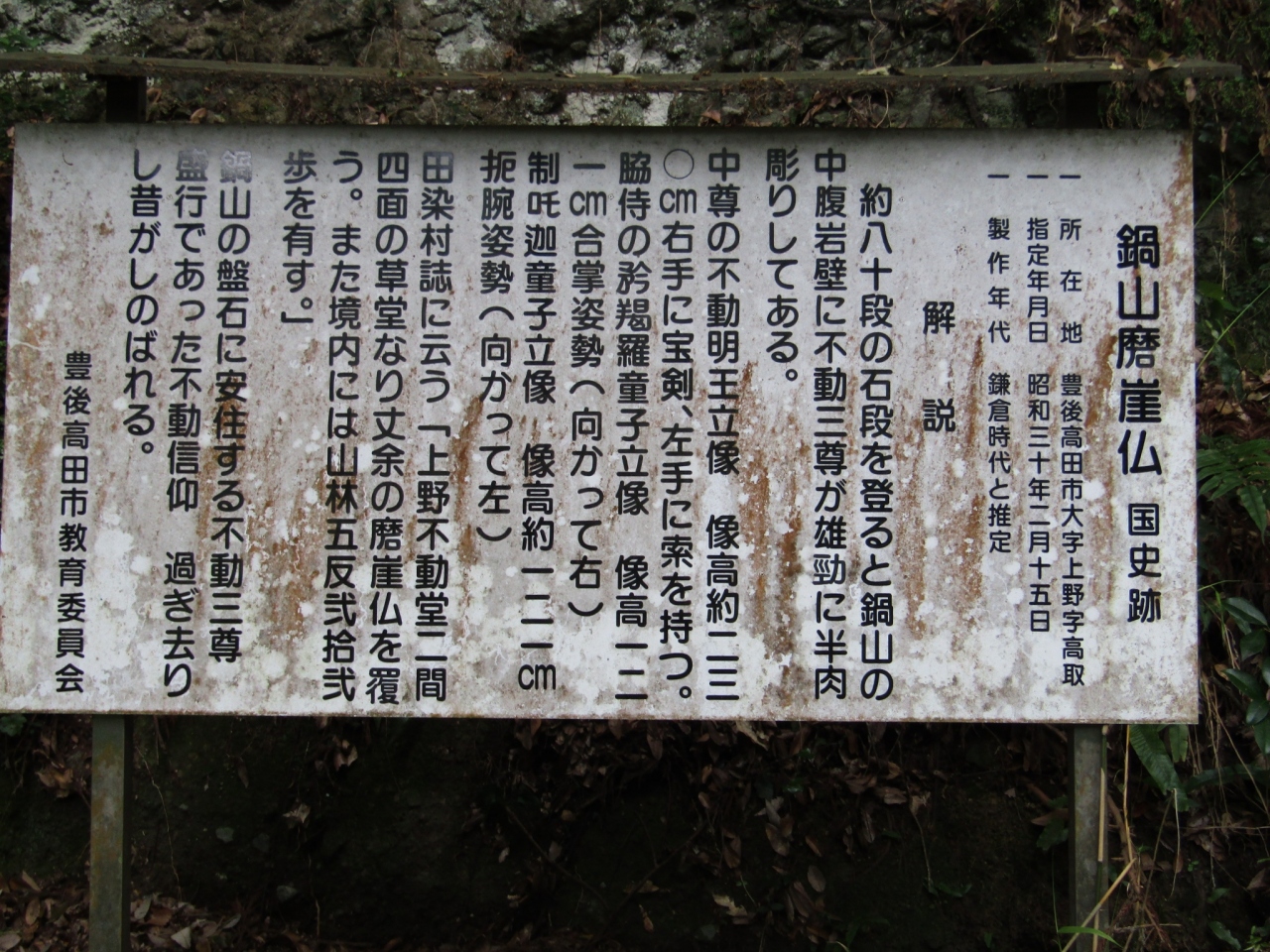 真木から県道34号線を東へ進み、道路沿いの「鍋山磨崖仏」の看板横から急な階段を80段上った所にあります。