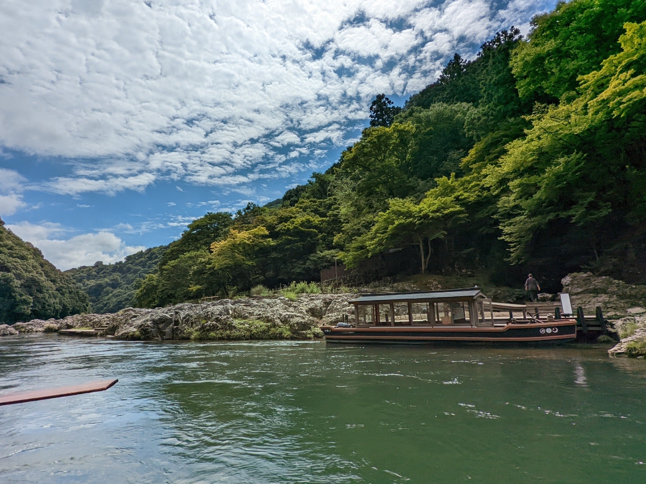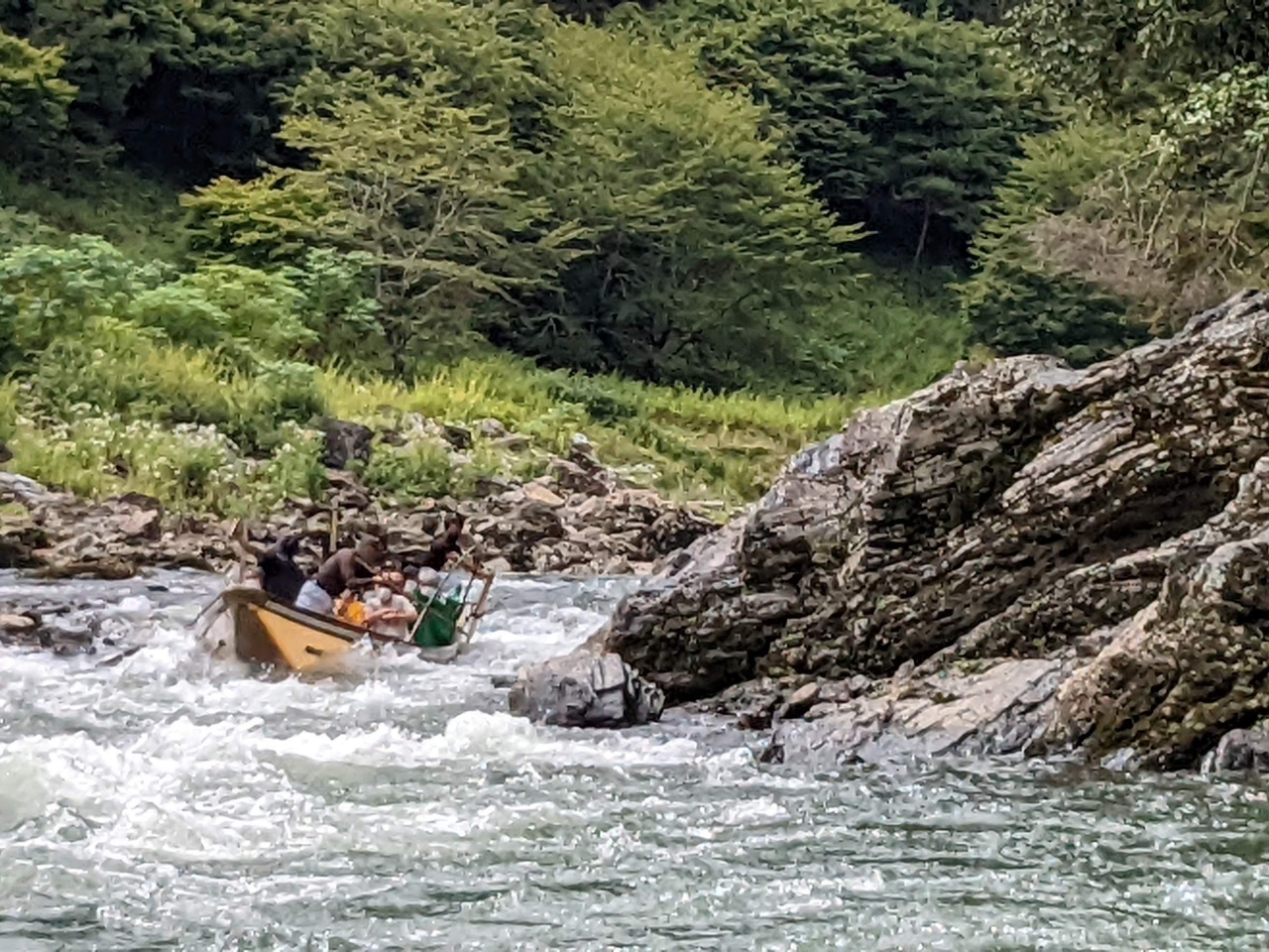 所々、急流があり水しぶきをよけるためサイドの防水シートを持って自分でガードします。2/3程進むと船頭さんが「後ろから3列目まで水かかるよーん」と教えてくれるのですが頭上を越える大量の水が飛んできました。水かかるよーんレベルじゃない。私は機敏にシートで防ぎましたが私の前のおじいさんはびしょ濡れでした。これが3回あり足元が濡れましたが夏でよかった。終盤は楽しかったです。次は流れの速い60分ルートに乗ってみたいです。