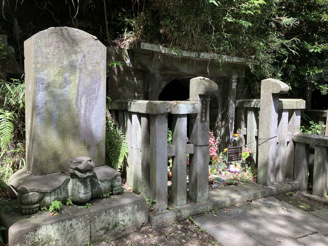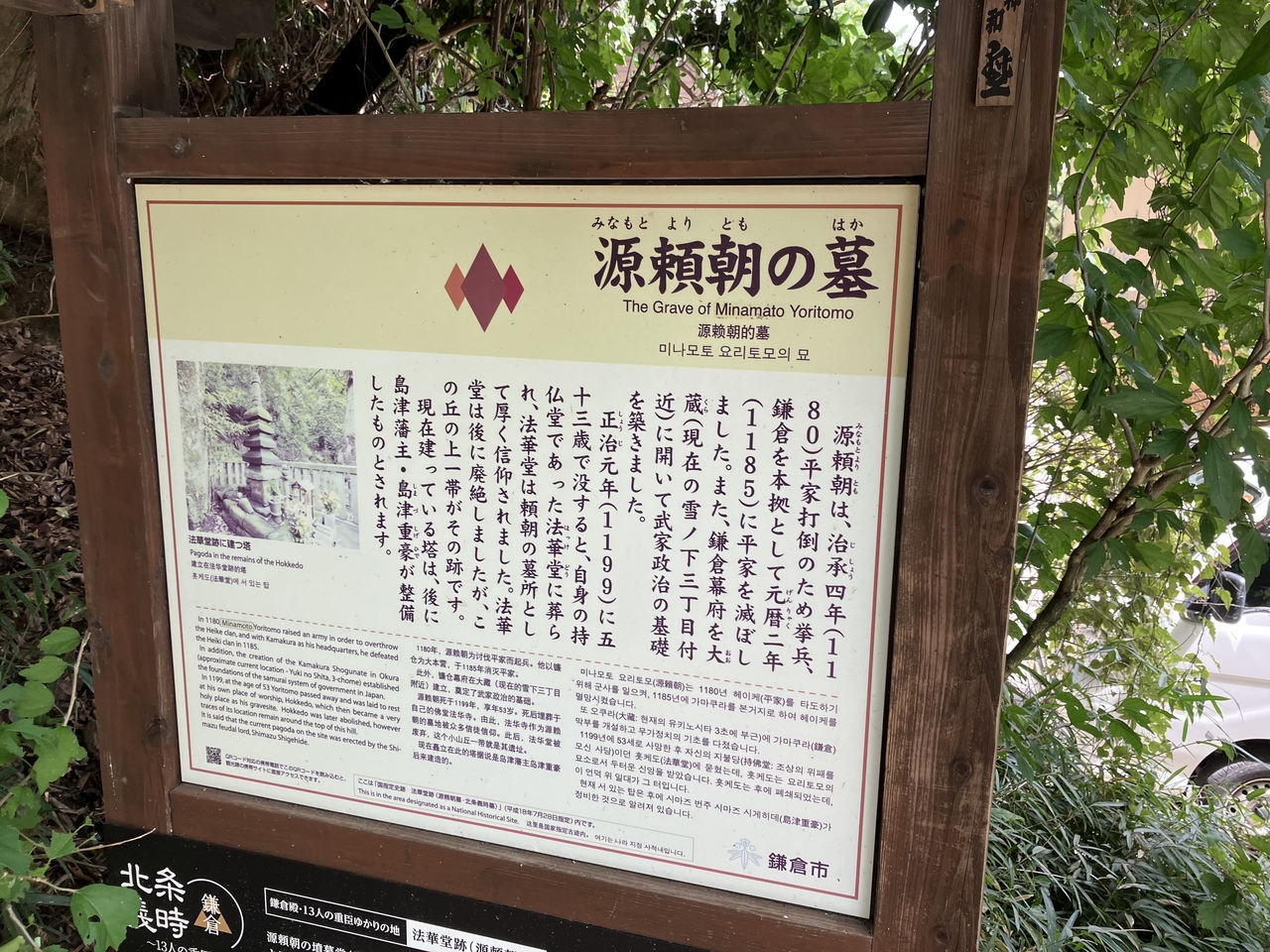 鎌倉駅から徒歩で20分ほどです。「金沢街道」北側の清泉小学校の裏手の山(大倉山)あります。NHK大河の影響か?今や連日観光客が訪れるスポットとなっています。以前10年ほど前に訪れた時は、人とすれ違うこともほとんどない山の中という印象でしたが、今回は急な石段を登る際は行列ができるほどでした。「頼朝の墓」とその一帯が法華堂跡とされています。北条義時の法華堂跡へは一旦石段を降りて、さらに東側の石段を登ることになります。法華堂跡は説明板のQRコードでCG画像が見られるようになっています。さらに石段を登っていくと大江広元らの櫓があります。くれぐれも足元に気をつけてください。