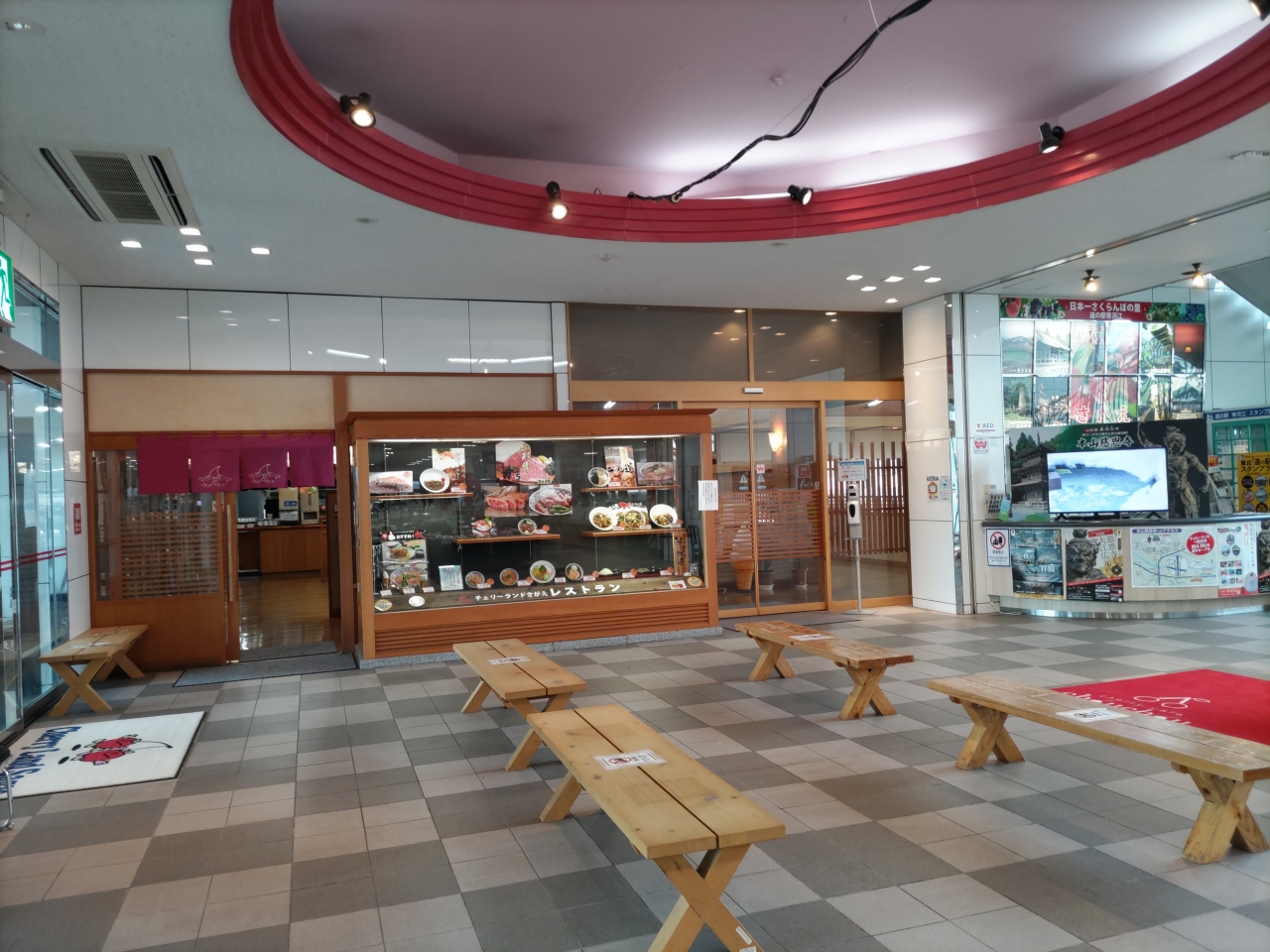 国道112号に面した東北最大規模の道の駅である。さくらんぼ会館、イベント広場、国際チェリーパークなどを併設している。土産物・地産品売場は広くて品数も豊富で、山形県および近県の名産品はそろっている。フードコートも広くてレストランは団体客用のスペースもある。昼食と買物等で約1時間半の時を過ごした。