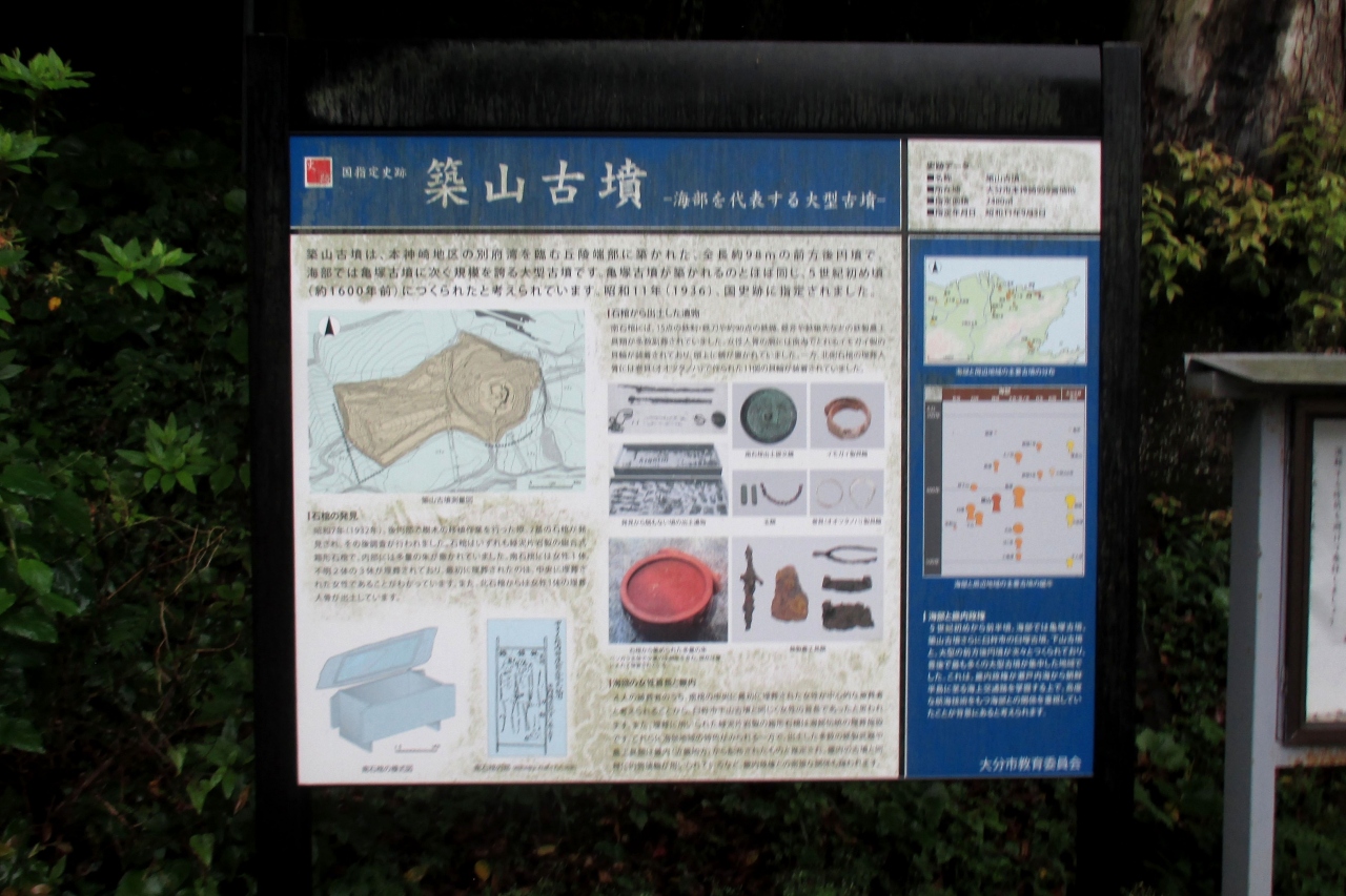 築山古墳は、亀塚古墳から東へ直線で6km弱の場所にありました。全長98mの前方後円墳とのことです。(亀塚古墳の様な復元はされていません)後円部の頂上に立つと、お互いが望めるそうですね。主となる被葬者が女性であることから、祭祀を司るシャーマンだろうとか、地元で神様として祀られている早吸日女ではないかとかいろいろといわれているそうですね。こちらは盗掘に遭っていないので、大量の副葬品が見付かったそうです。可能ならば、亀塚古墳の様に復元して貰いたいですねぇ。