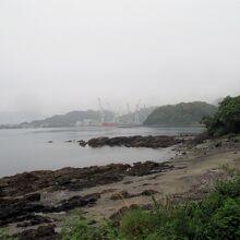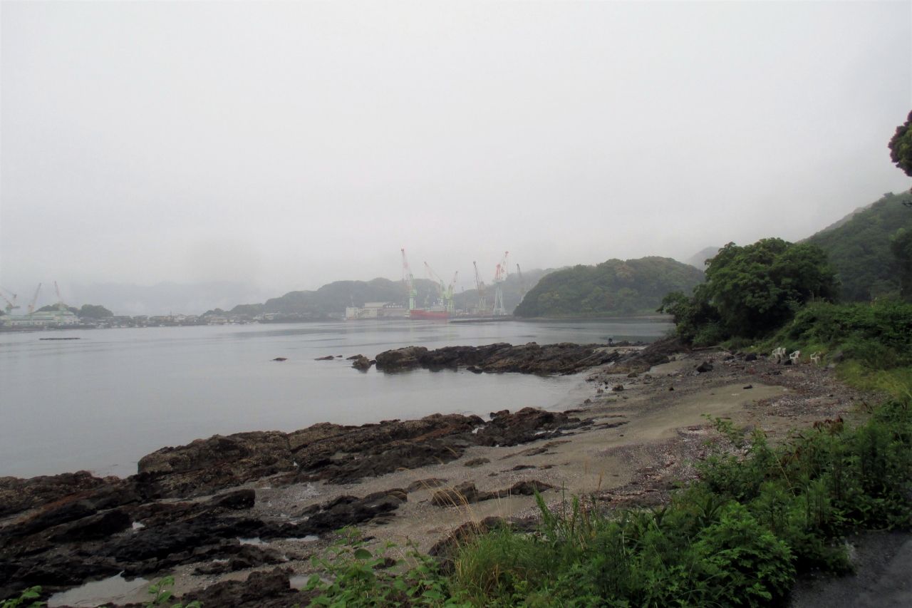 佐志生から下ノ江港と案内された道へ入り、下ノ江海岸沿いの道を進みました。沖合には三ツ子島が、島というよりも岩といった感じに小さく見えました、カキなどの養殖が行われているとのことですが、三ツ子島に近いところで行なわれている様で、海岸からはよく見えませんでした。入り江の奥まで進むと、造船所の大きなクレーンがたくさん見えました。南日本造船という会社だそうです。造船中と思われる赤い船体が見えました。
