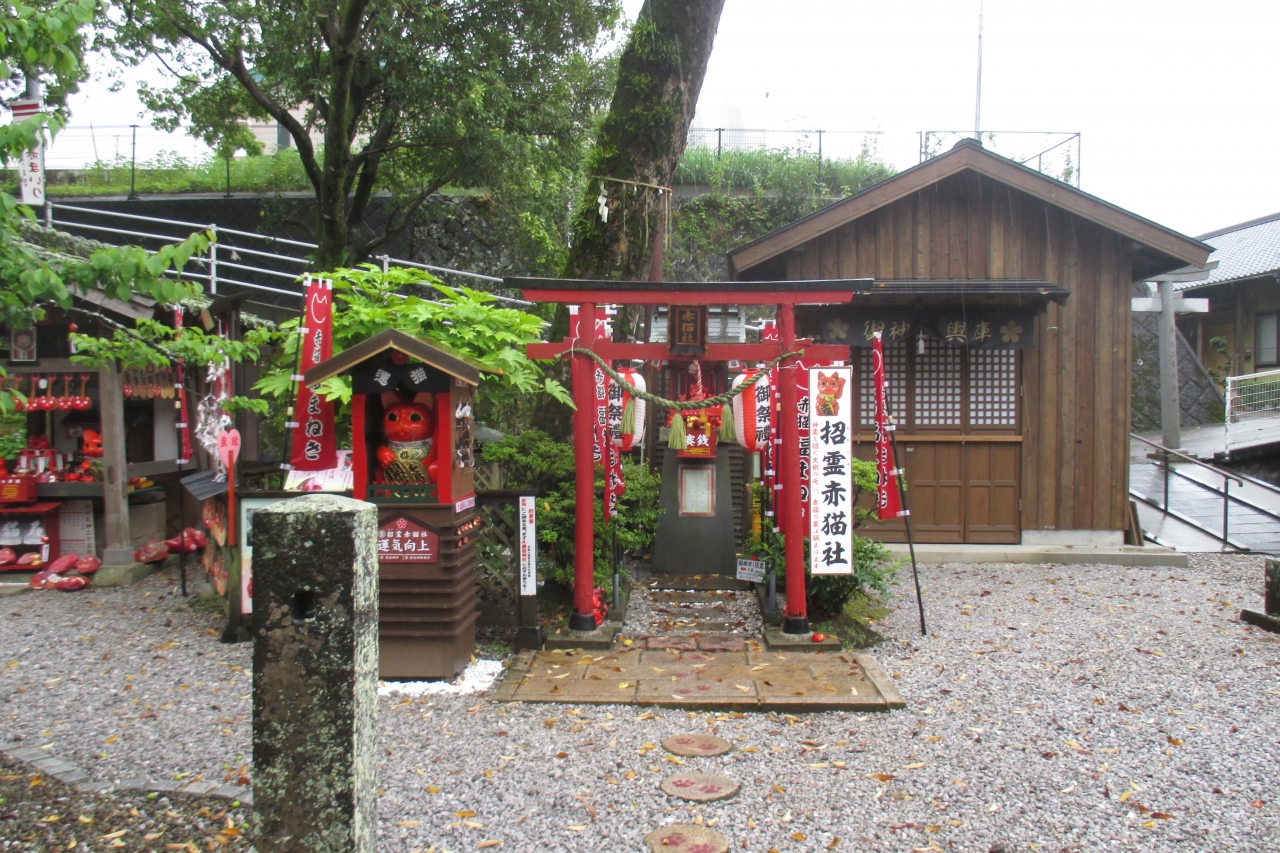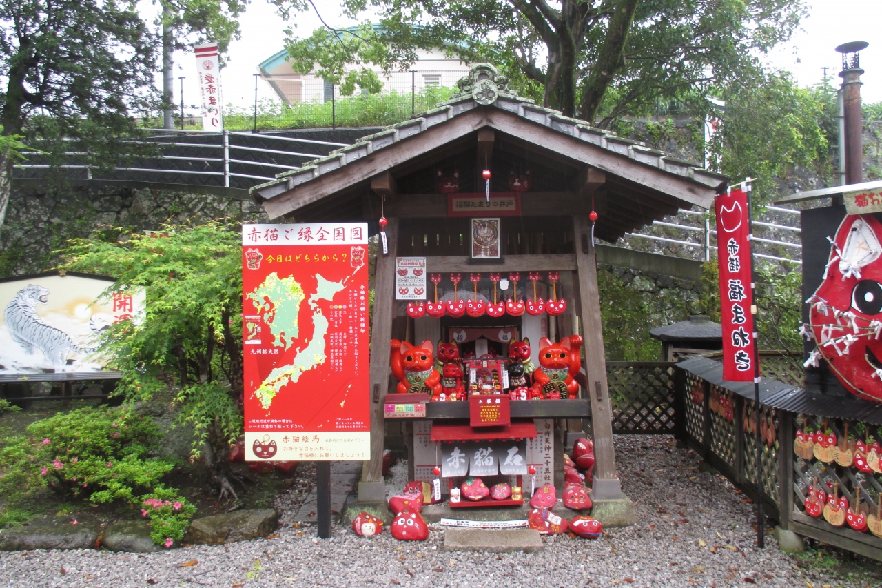 福良天満宮をお参りすると、赤い招き猫(赤猫)がたくさん納められていました。拝殿横には招霊(おがたま)赤猫社がありました。赤猫と呼ばれたのは大塚幸兵衛という臼杵商人で、商才に長けていて大成功を収めたそうですね。臼杵には旧来からの商業地・町八町と新興の商業地・平清水があり、幸兵衛は平清水の商人だったので、町八町の商人からは、ずるがしこいとかケチでがめついとか悪口をいわれ、赤猫はその代名詞になってしまったそうです。しかし、実際の幸兵衛は常に地元の繁栄を図り、災害が起きれば私財を投じて救済にあたる好人物だったのです。そこで、平清水の氏神様である福良天満宮に、福を呼ぶ赤猫として祀られているのだそうです。なお、幸兵衛も毎日お参りしていたという、商人の信仰を集めてきた愛宕神社が境内社の1つにありました。