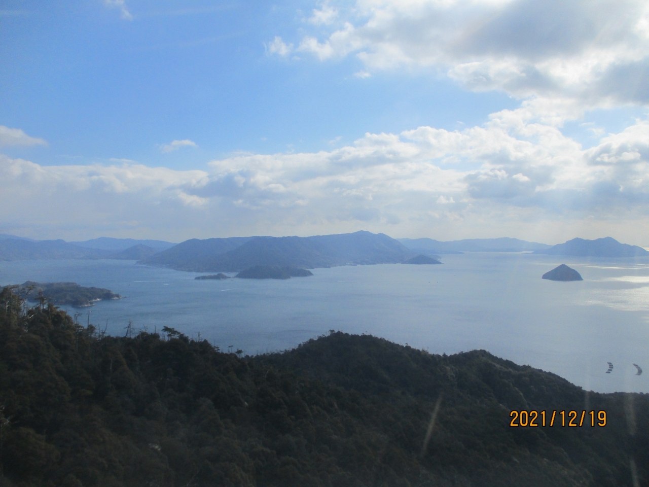 このロープウェイで榧谷でのりかえ、獅子岩まで行くと、弥山山頂まであと少しで、楽にいくことができます。日本では珍しい循環式と、交走式という2種類の方式で運行しているそうです。ロープウェイに乗り、上にあがっていくにつれ、素晴らしい展望が見えてきました。