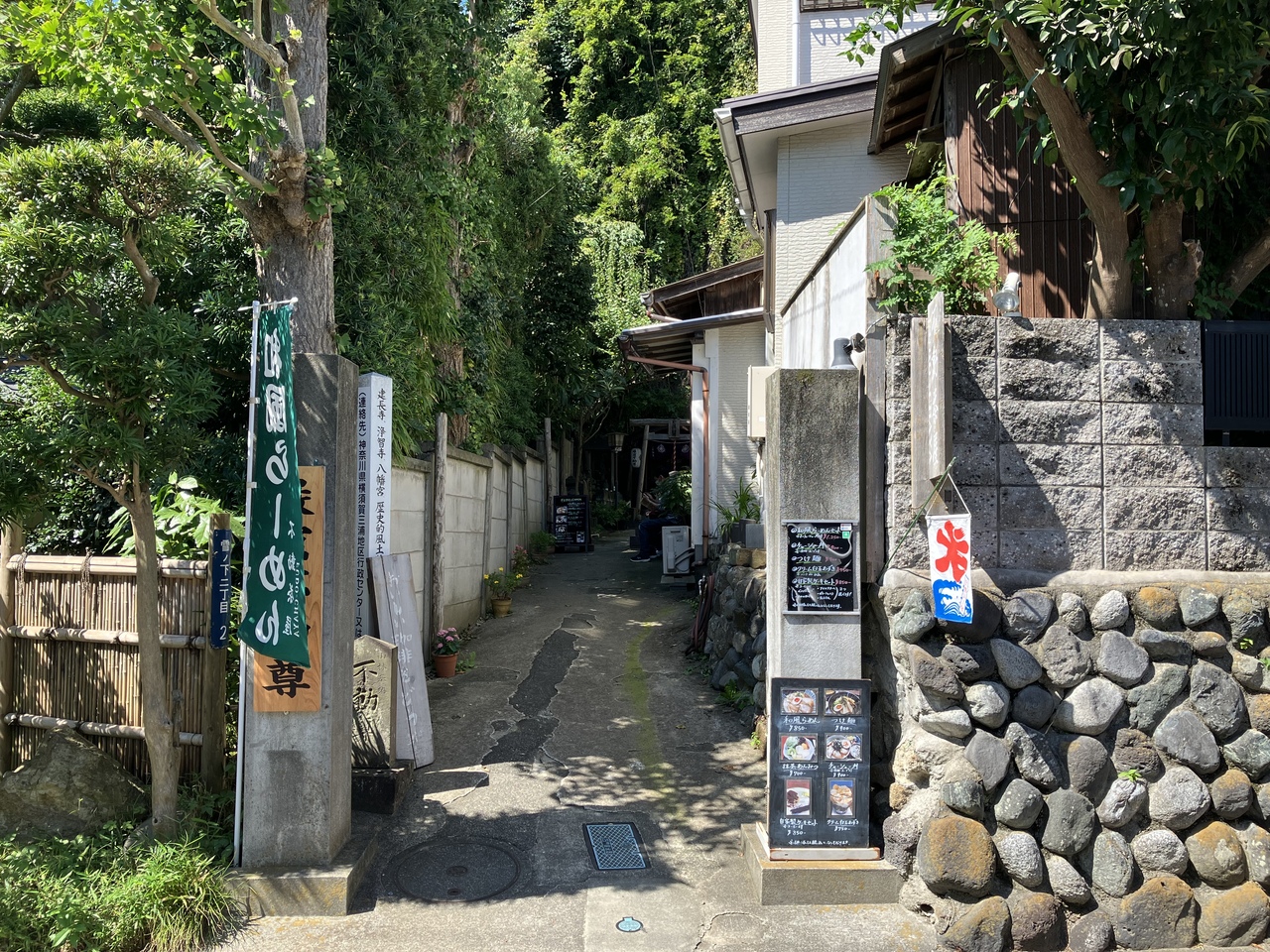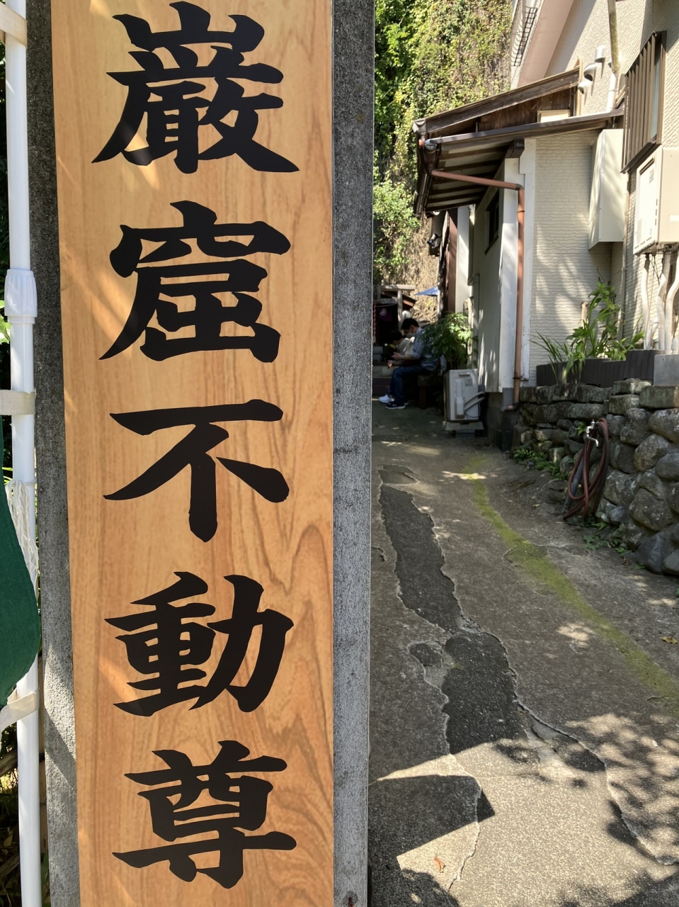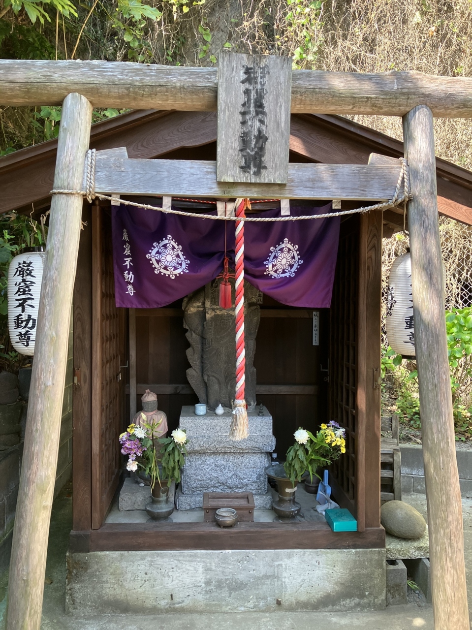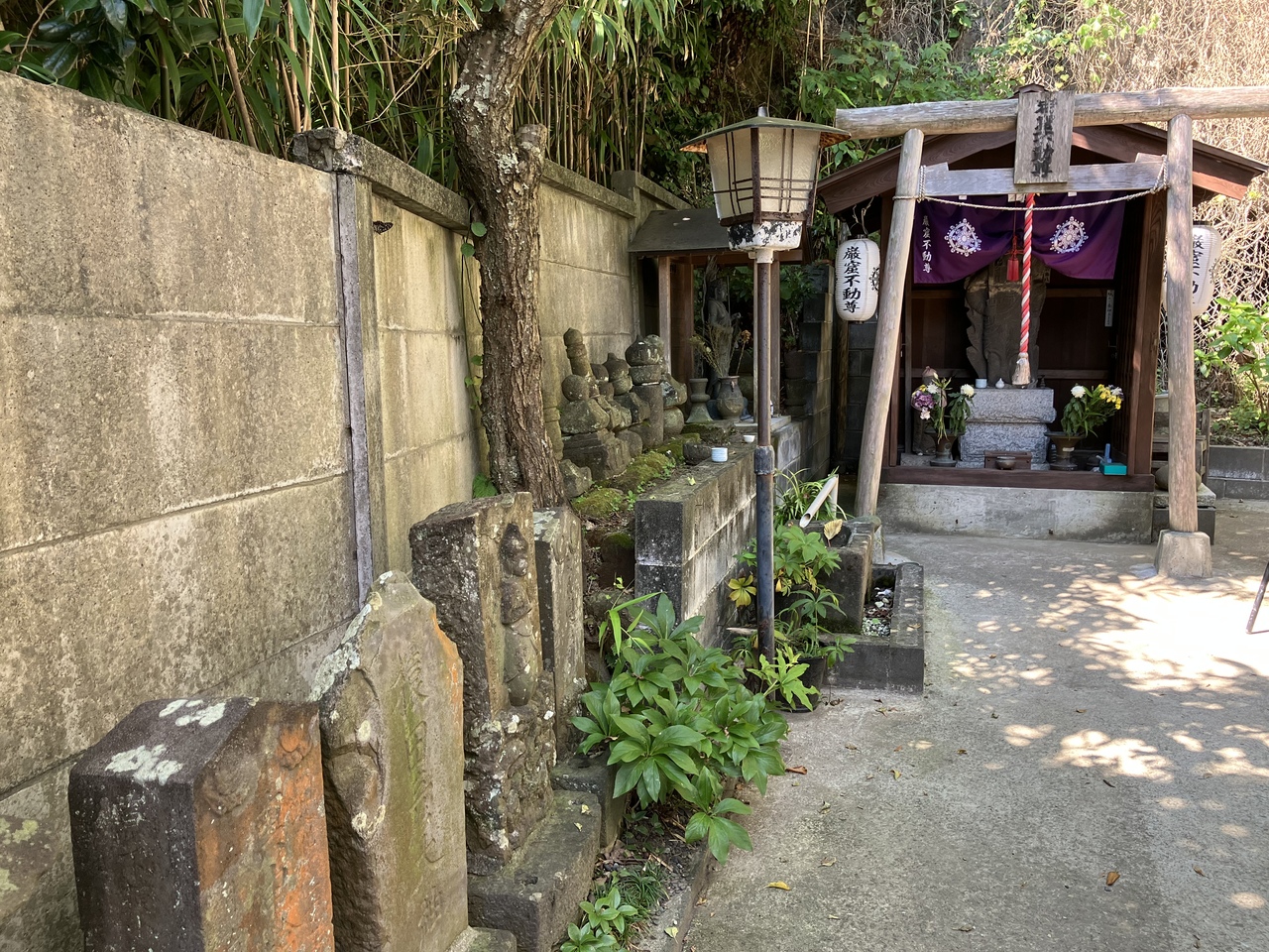 鎌倉駅から徒歩で15分ほどです。川喜多映画記念館前の「横大路」を西へ進むと「不動茶屋」という幟が立っています。入口奥に小さなお祠があります。石の不動明王が本尊です。1184年以前からあったようです。最初は巌窟の中に祀られていましたが、崩落の危険があるので、この場所に移動されたということです。巌窟の中にあった庚申塔や五輪塔なども数多く傍に並べています。幕府成立以前からこの場所で信仰されていたことを考えると感慨深いですね。(こちらの茶屋のラーメンは人気ですヨ!)