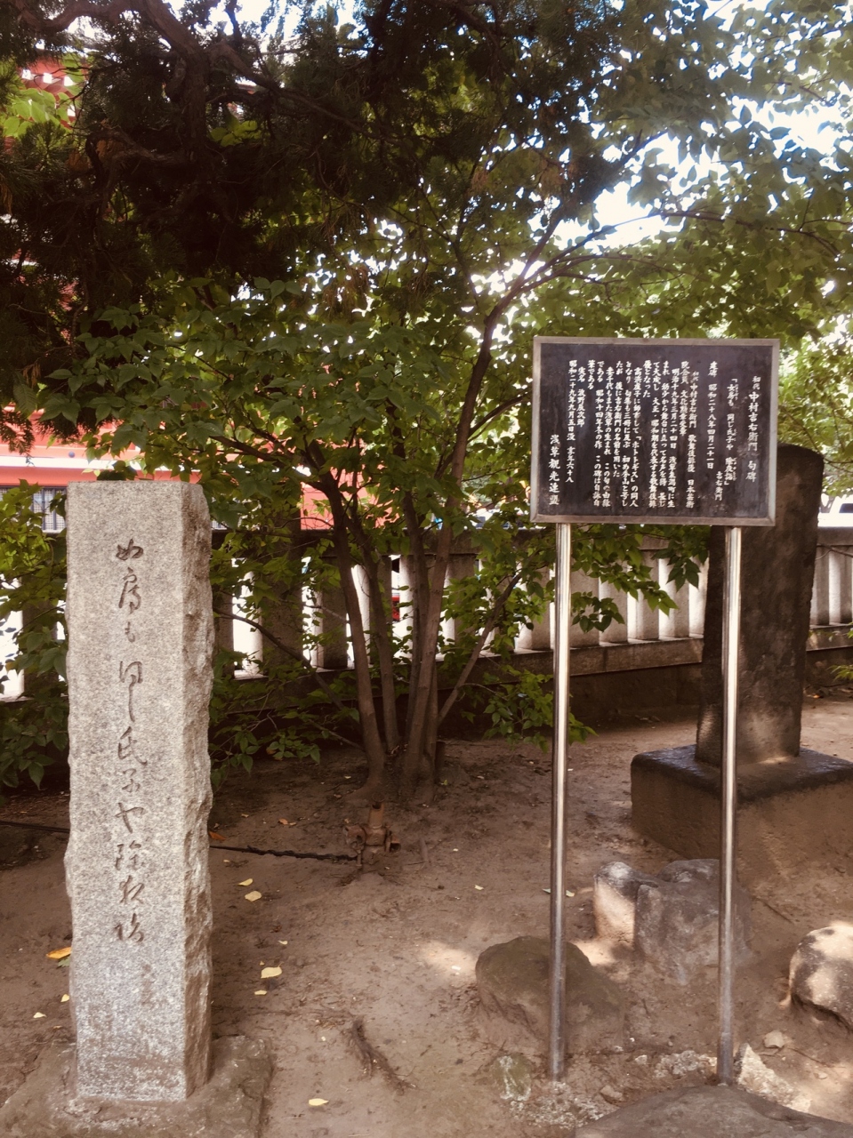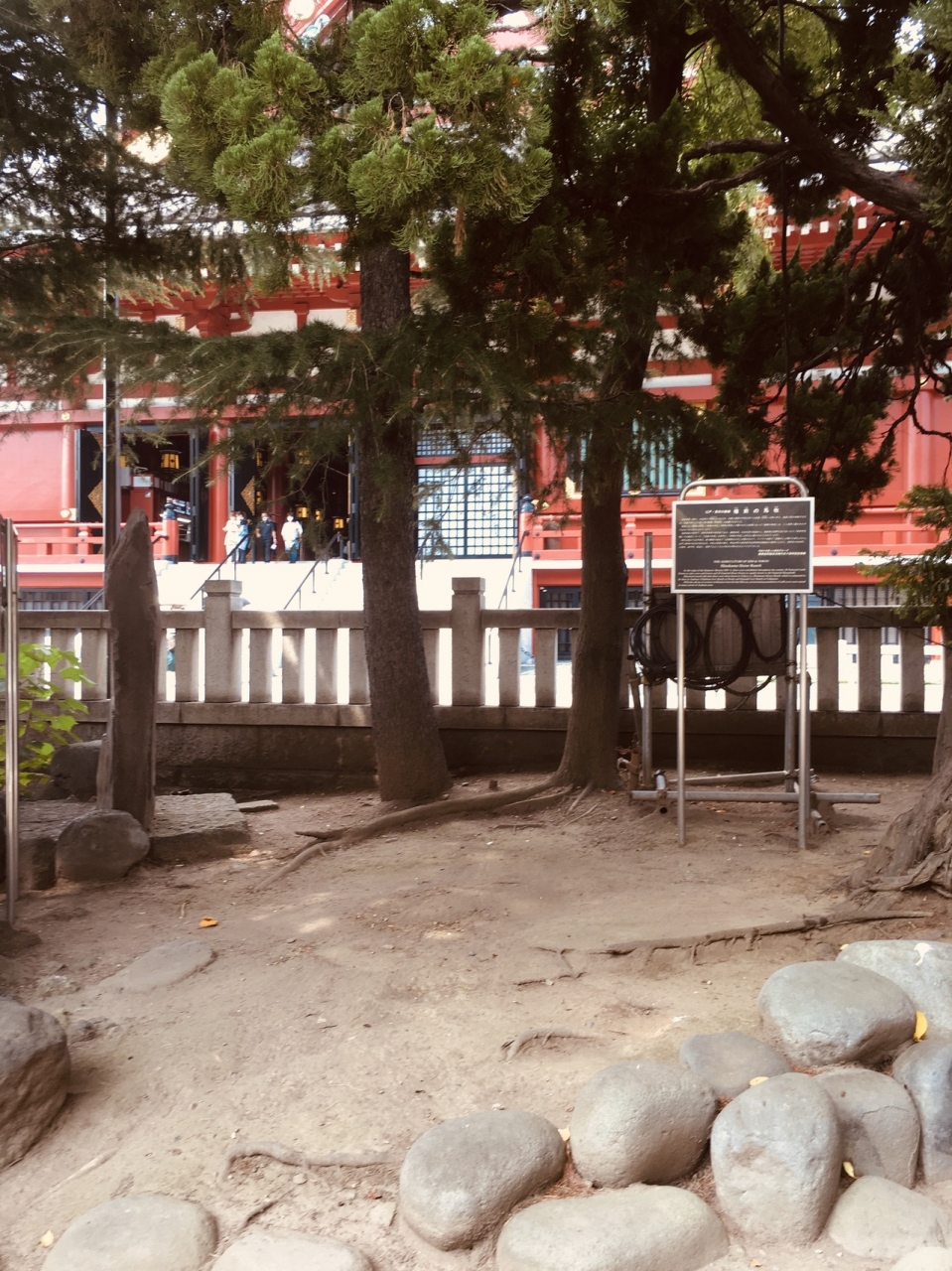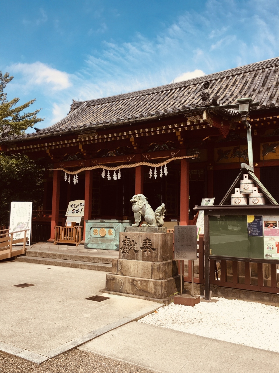 浅草寺内にある神社で、鳥を潜ると左右に石碑等があり木々に囲まれていたので涼しげな場所でした。中央部分は空間になっていて、手水場から出ている水は龍の嘴から出ていました。赤い社殿の前の獅子の像が怖い顔をしていました。