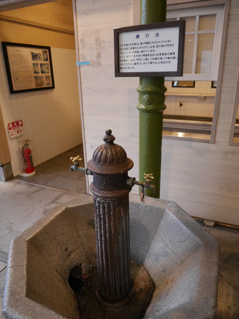 JR門司港駅構内、公衆トイレの前に「帰り水」があります。大正3年に駅舎が完成した時に設置されたものが、当時のままの形で残され、蛇口をひねると水道水が流れ出ます。案内書きによると、かつて門司に到着した旅行者や戦地から復員した方々が喉を潤したことが、「帰り水」の名称の由来ということです。門司港レトロを象徴するような光景と感じました。