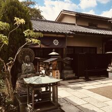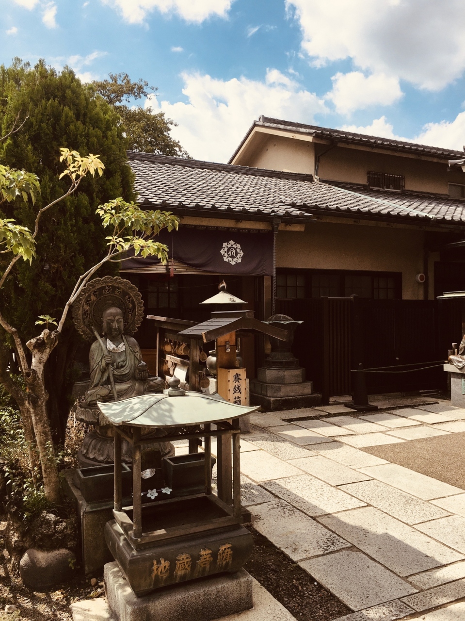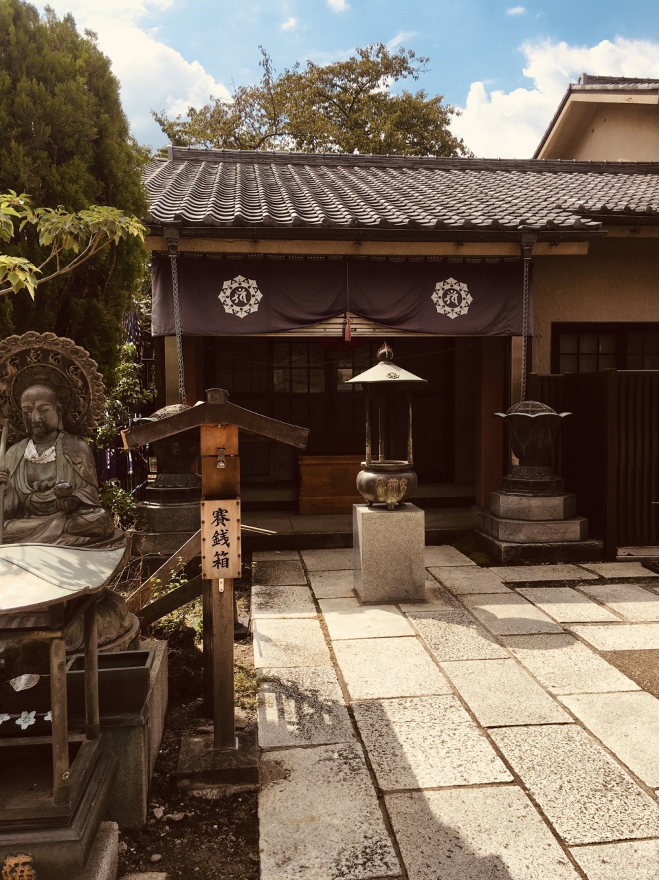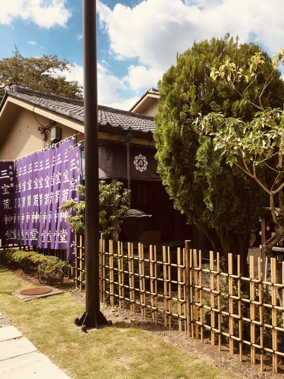 五重塔の横にありました。紫の旗が靡き、地蔵尊菩薩があって、その前には、お線香立てがありました。木の小さな賽銭箱の後ろには、瓢箪のかたちをした絵馬がたくさんありました。瓦屋根の平家のような感じの建物でした。