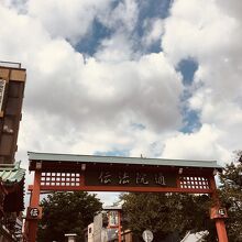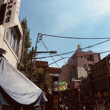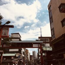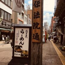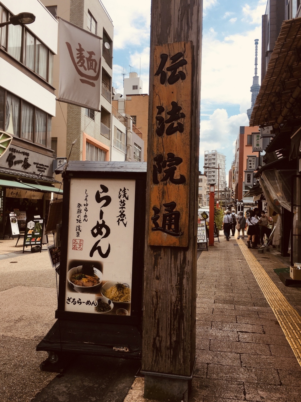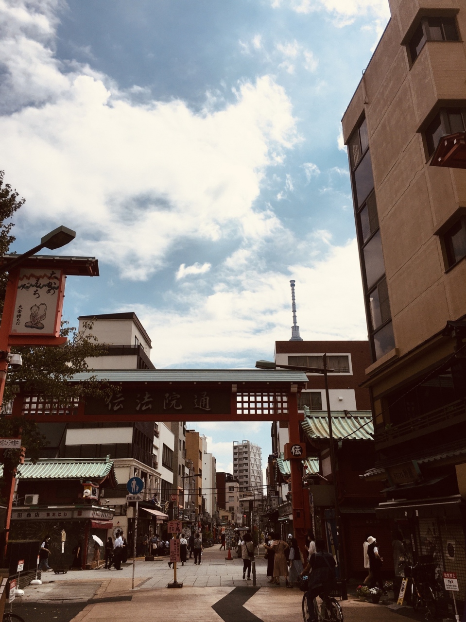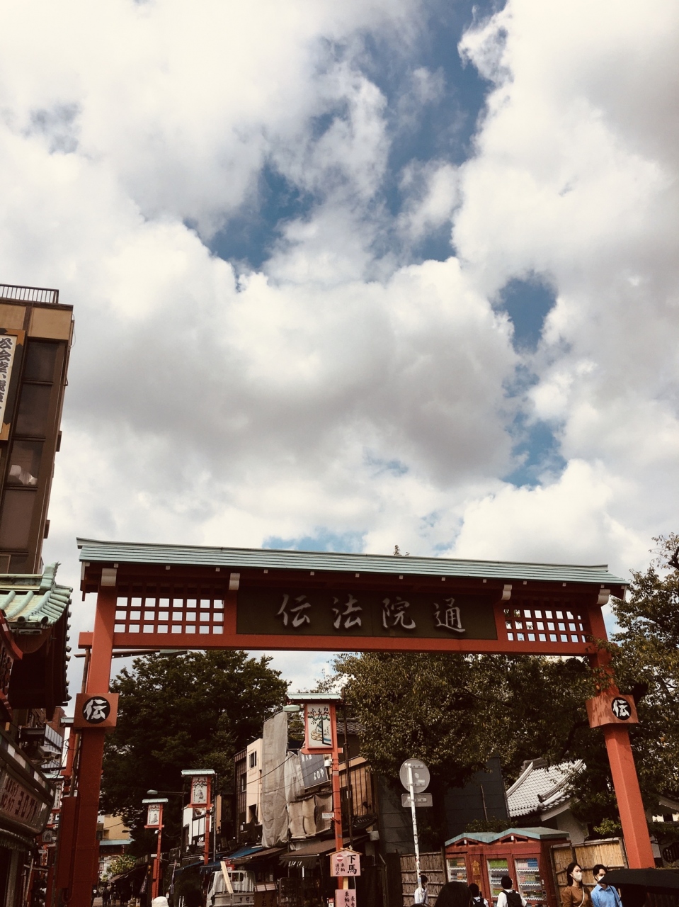 伝法院と言う寺があり幼稚園もありました。寺に沿った道で、仲見世通りから分岐した道なので人通りが多く、食べ物屋等も多かったです。赤い門があり、沿道には、赤い柱があり異なる絵が描かれていました。東京スカイツリーも見える通りです。