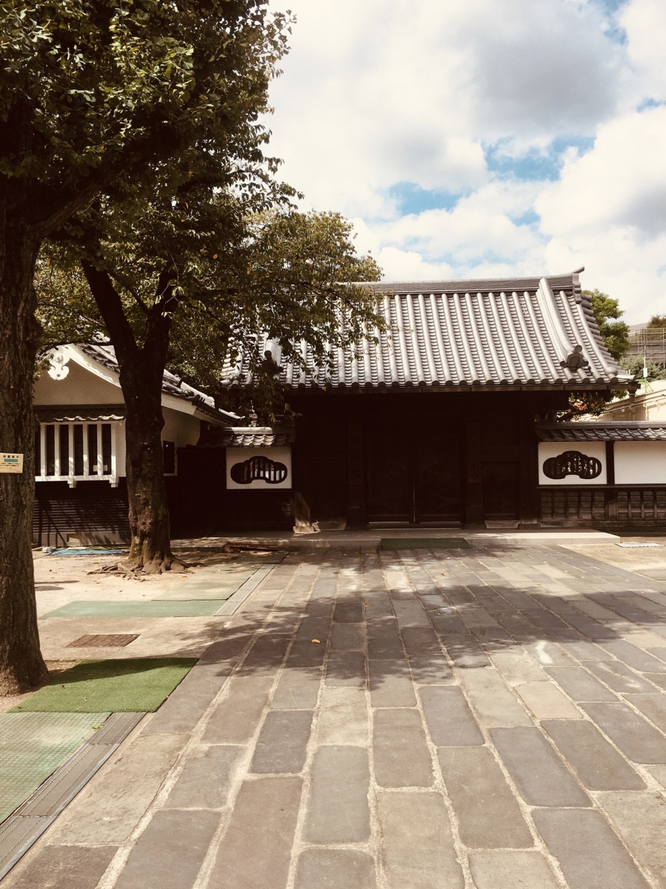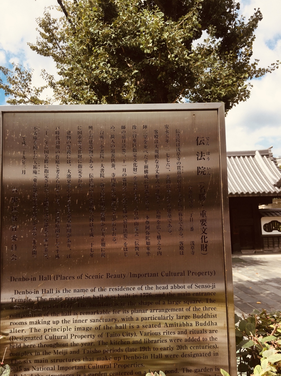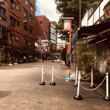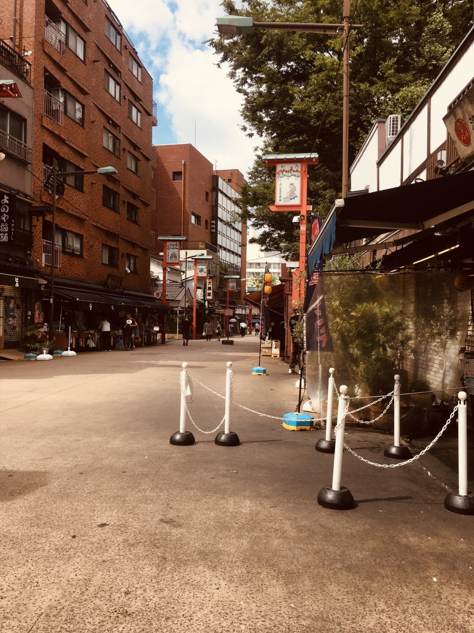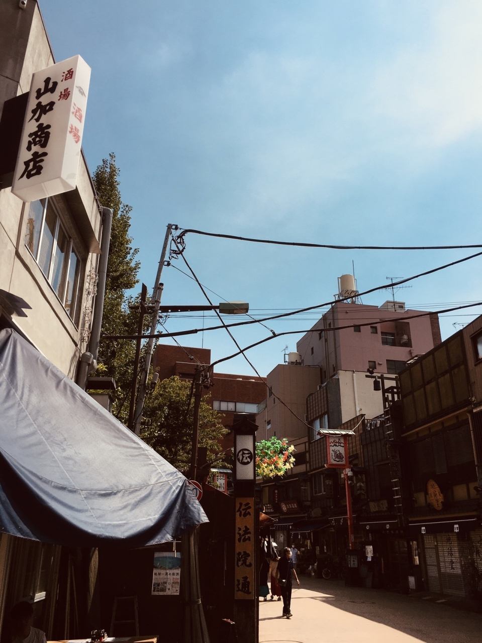 伝法院と言う寺があり幼稚園もありました。寺に沿った道で、仲見世通りから分岐した道なので人通りが多く、食べ物屋等も多かったです。赤い門があり、沿道には、赤い柱があり異なる絵が描かれていました。東京スカイツリーも見える通りです。