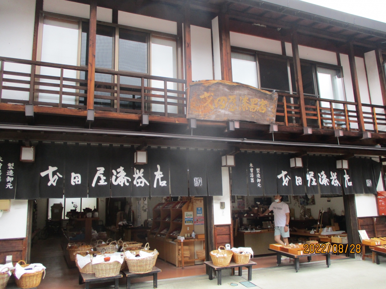 奈良井宿の上町にありました。間口が広い。製造卸元として、様々な漆器を扱っていて、100円くらいの小物から数百万円する高級美術品まで扱っているそうです。家具も無垢仕上げの注文家具から和洋家具まで扱っているということでした。