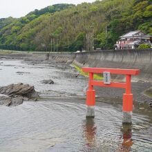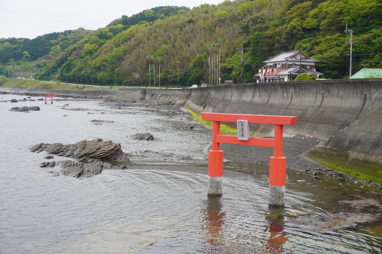 おっぱい岩は、海水の力によってできたという変形岩で、女性の乳房に似ているのでおっぱい岩。おっぱい岩に至る海岸には赤い鳥居が建っていて道順を示していましたが、満潮なのでこの日は近づけず。駐車場のところに、「1億年の大地の記録」と題した詳しい説明版がありました。